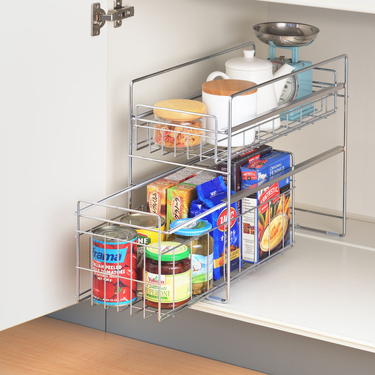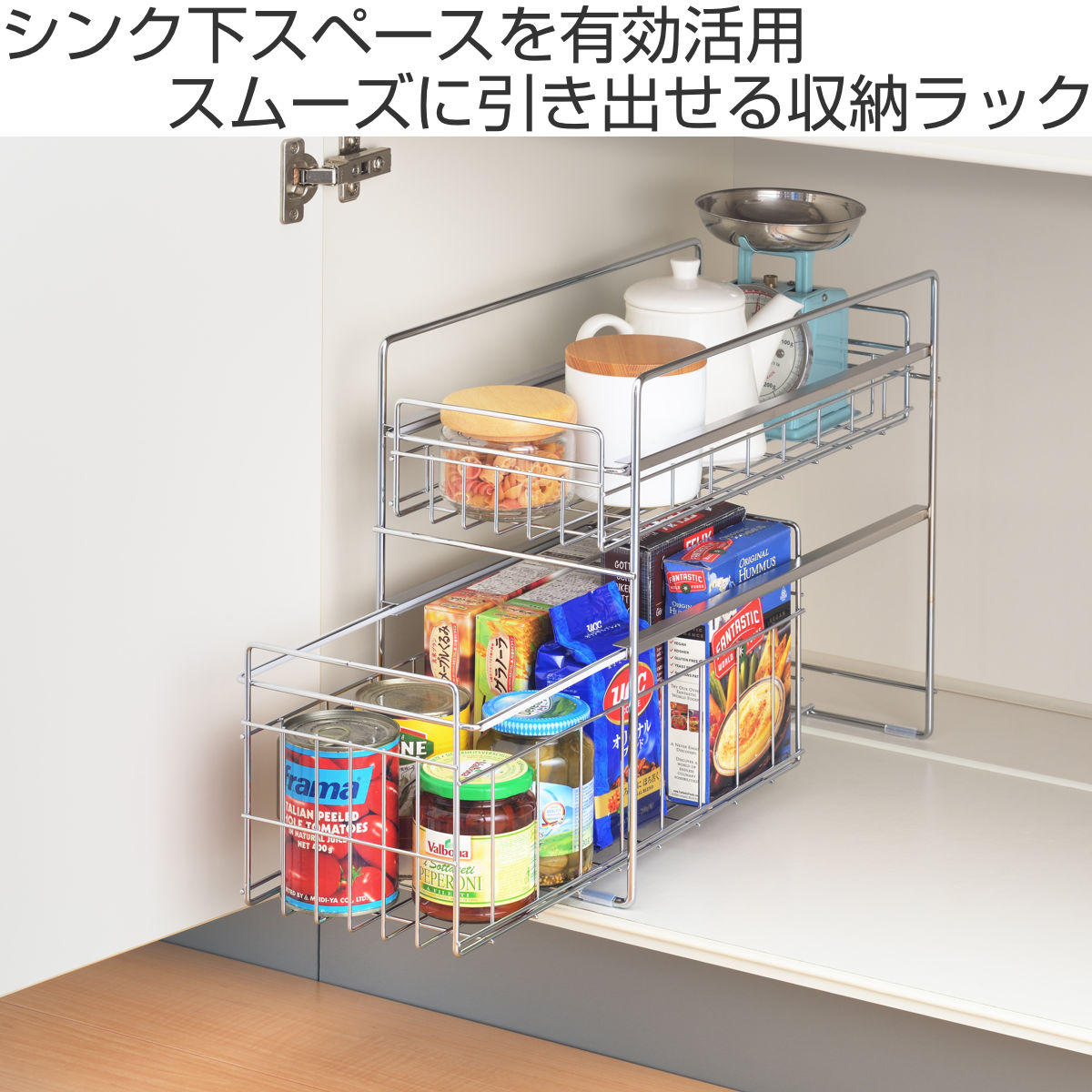 シンク下のスペースを有効活用できる収納ラックです。引き出しタイプなので奥の物も取り出しやすく、調理器具やストック品などをすっきり整理できます。