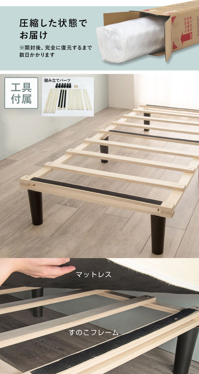 マットレスは搬入しやすいよう圧縮してコンパクトに梱包されています。すのこフレームは付属の六角レンチでパーツを組み合わせるだけの簡単組み立て。特別な工具を用意する必要もありません。組み立てたフレームにマットレスを乗せるだけで設置が完了し、面ファスナーのような強力テープで固定されるため、使用中もズレにくく安心してお使いいただけます。