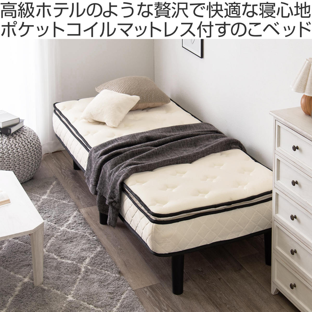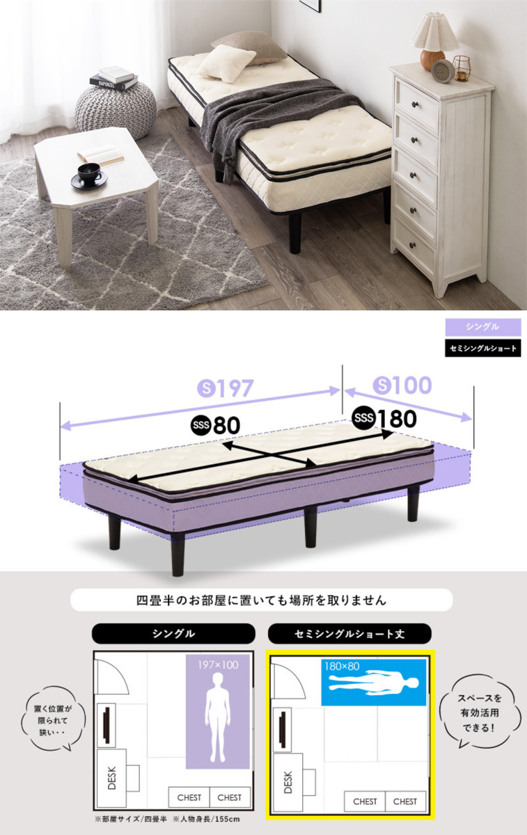 マットレス付きベッド ショートセミシングルショート ポケットコイルマットレス 組立簡単