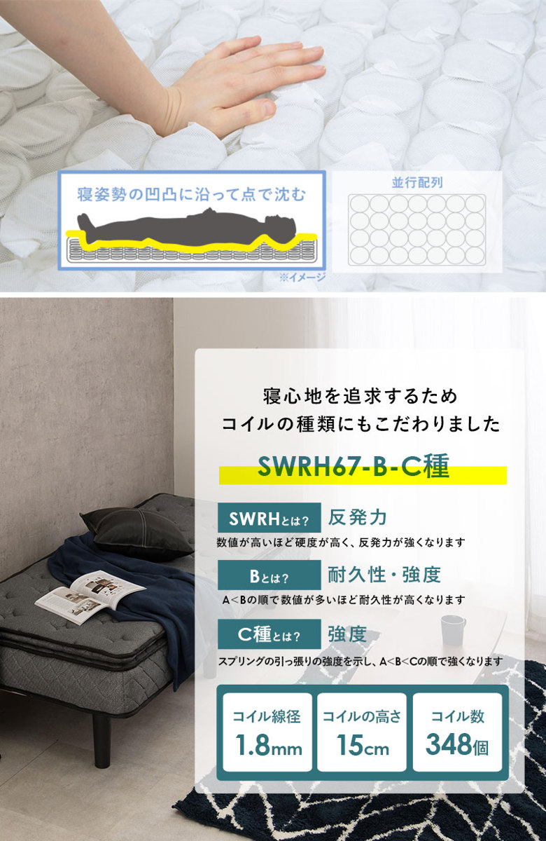 マットレスには、体型や寝姿勢の凹凸に合わせて点で支えるポケットコイルを採用。体にフィットしやすく、自然な寝姿勢をサポートします。さらに、コイル同士の接触が少ない「並列配列」を採用しているため、通気性と耐久性にも配慮された構造です。