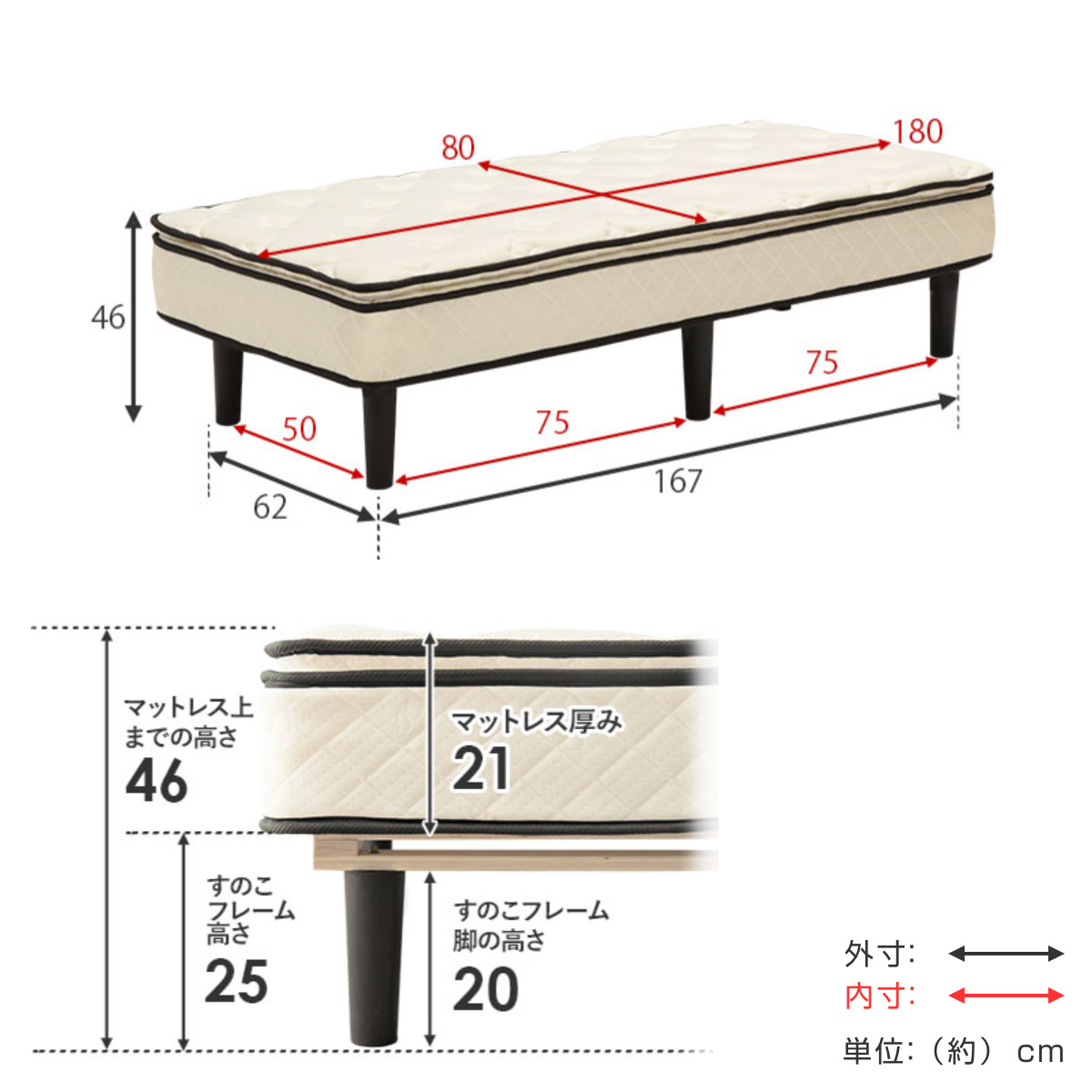 | サイズ | 約 幅80×奥行180×高さ46(cm) マットレス:約 幅80×奥行180×高さ21(cm) |