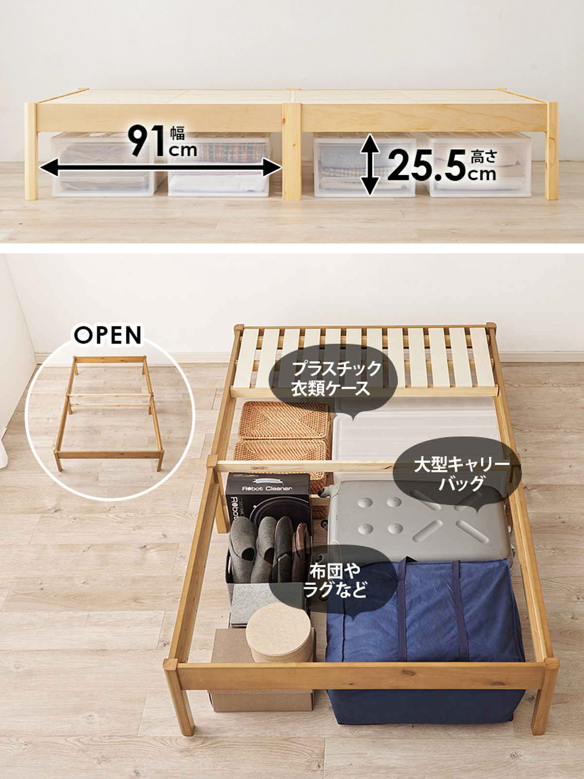 ベッド下に、キャリーバッグや布団などのかさばる物も収納できるスペースがあります。収納スペースに限りのあるお部屋でも、ベッド下のスペースを上手く使うことでスッキリと整い、ゆとりのある空間が生まれます。