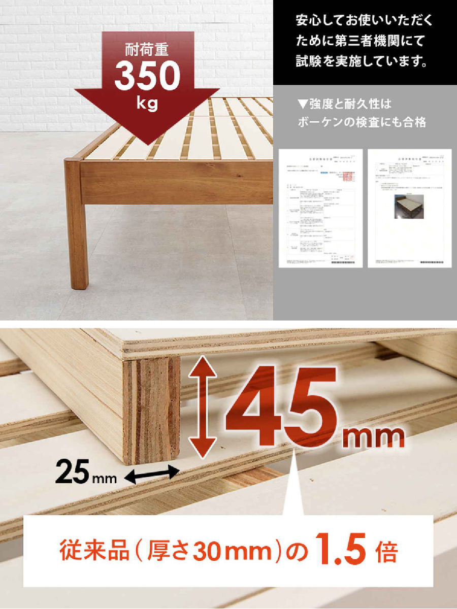 耐荷重は350kgと高耐久仕様です。すのこを支える12本の桟木を厚くして強度を上げることで、きしみやたわみを軽減します。