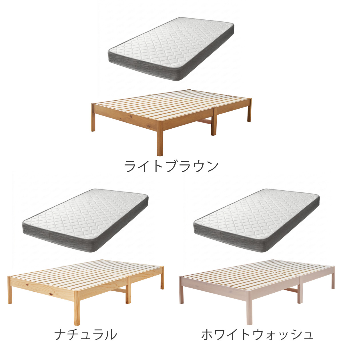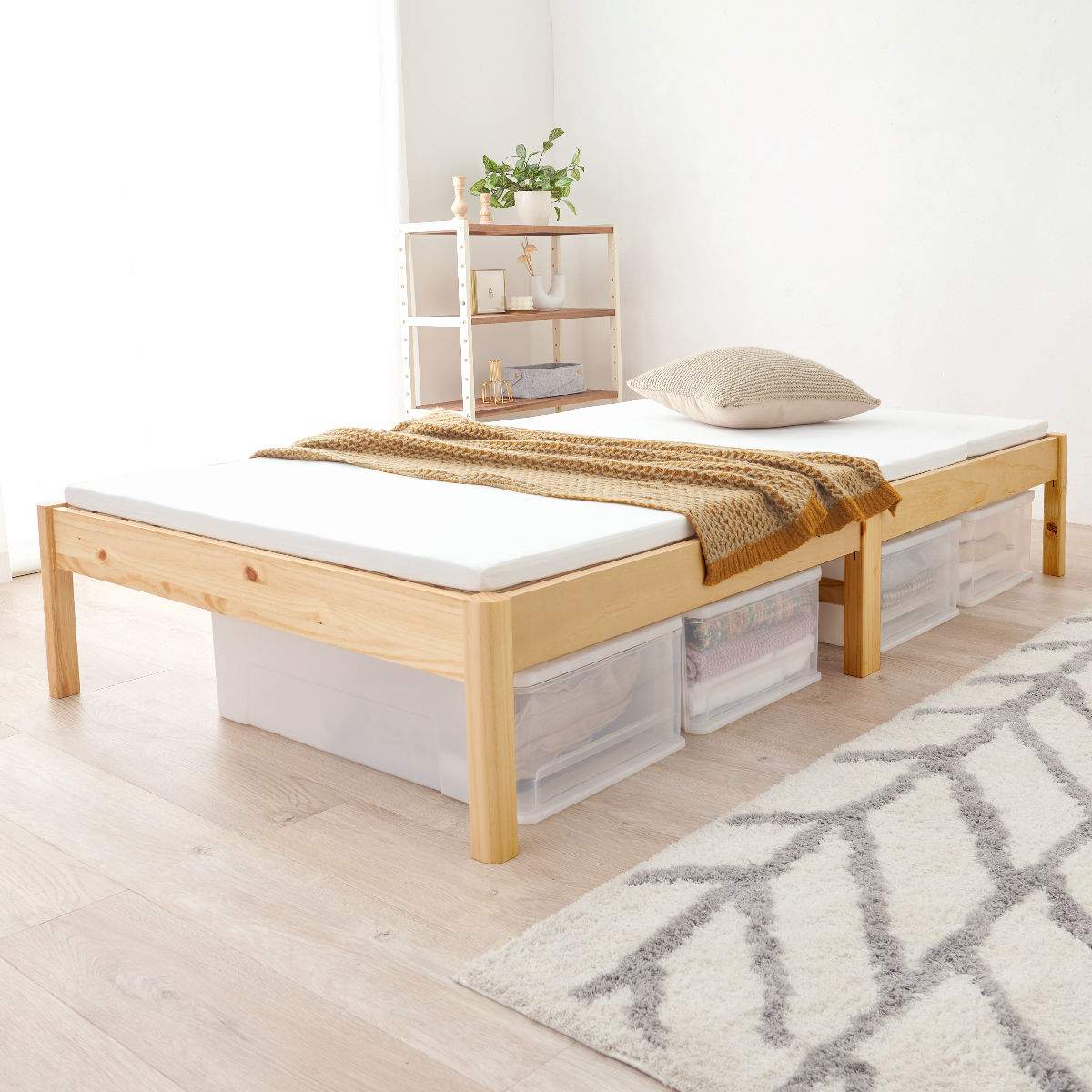 ネジや工具が不要で、簡単に組み立てられるベッドフレームとボンネルコイルマットレスです。パーツを差し込むだけなので、組み立て家具が苦手な方でもたった3分で組み立てることができます。天然木の温もりを感じられる柔らかなパイン材を使用しており、美しい木目と経年による色の変化も楽しめます。