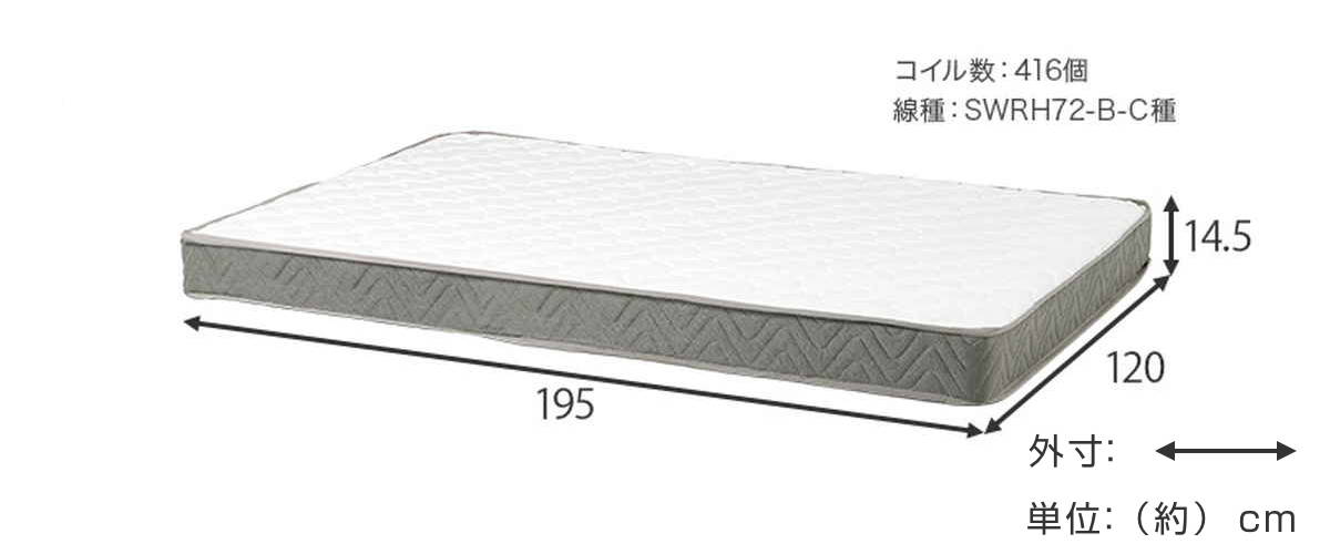 | サイズ | ベッド:約 幅122.5×奥行198×高さ36.5(cm) マットレス:約 幅120×奥行195×高さ14.5(cm) |