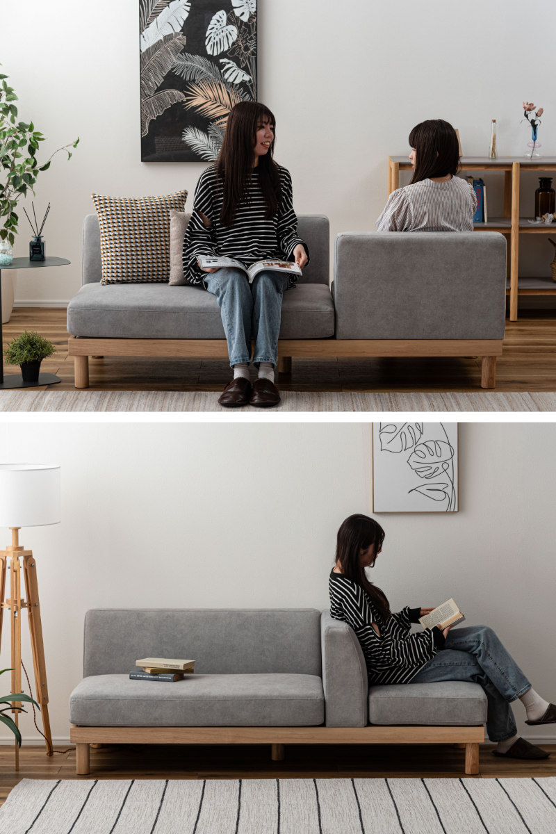 座面を分けて配置すれば、対面で会話を楽しめるレイアウトに。来客時や家族との団らんなど、シーンに合わせて使えます。背もたれを分ければ、同じ空間にいながらそれぞれの時間を心地よく過ごせるスタイルに。ほどよい距離感で、くつろぎ方が広がります。
