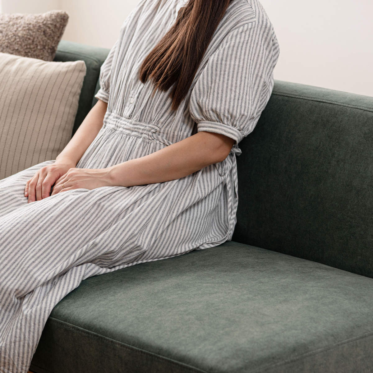 ソファの張地には、しっとりとした肌ざわりのファブリックを使用しています。やさしい触り心地で、長時間座っていても快適です。