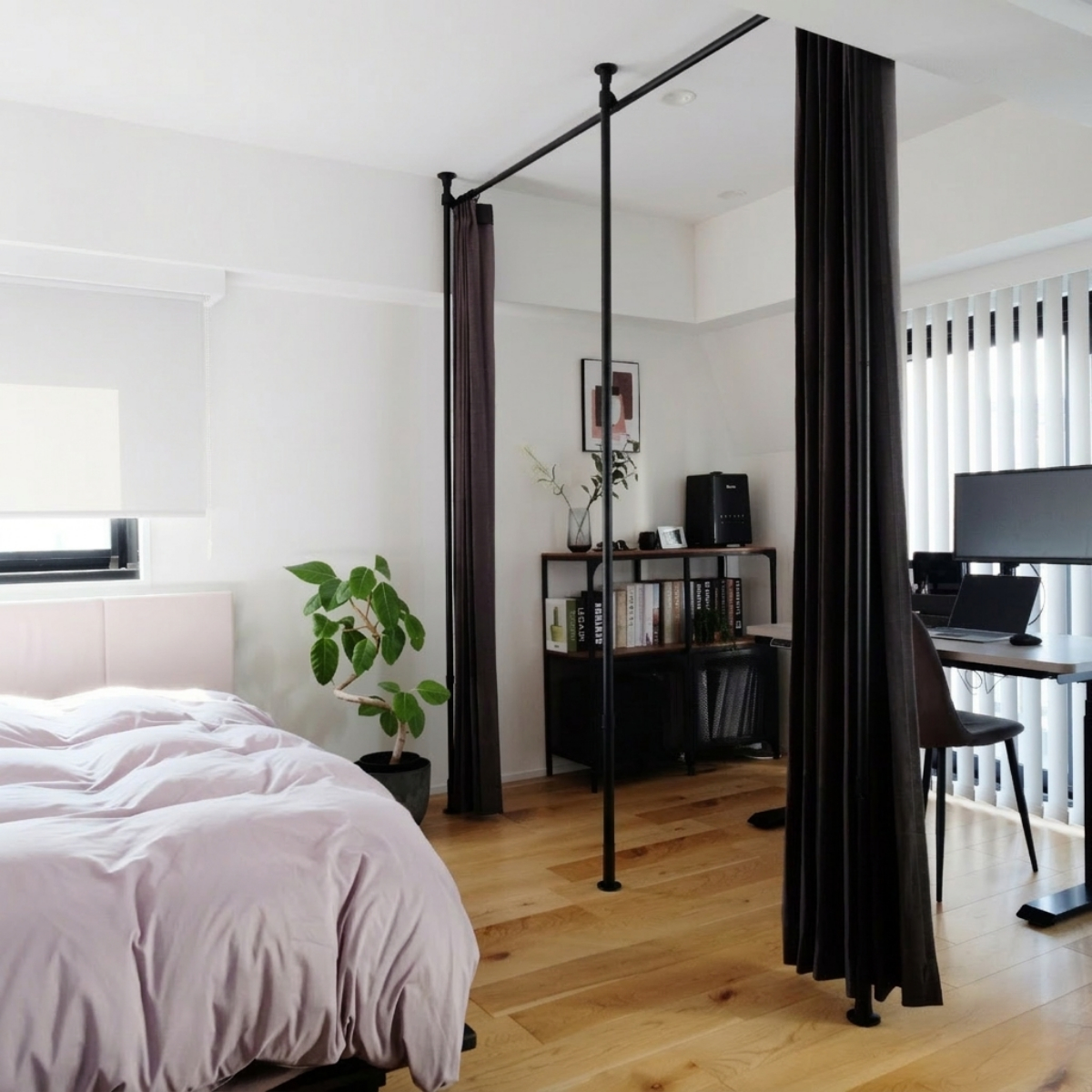 設置場所に合わせて柔軟にサイズ調整ができ、リビング、寝室、玄関、ランドリースペースなど幅広いシーンに対応します。シンプルで圧迫感の少ないデザインは、空間に自然に馴染みながら、プライバシー確保や動線の区切りに最適。「見せない」「仕切る」「整える」を、これ1セットでスマートに実現します。