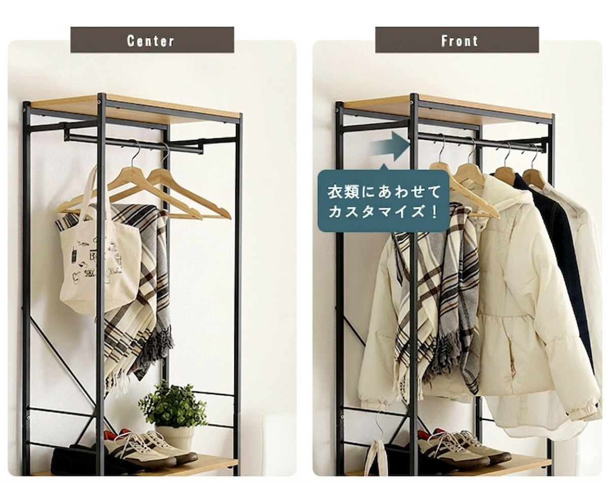 ちょっとしたスペースにも設置できる、スリム設計のハンガーラックです。ハンガーポールは前後の位置を調整できるため、設置場所や使い方に合わせて自由にレイアウト可能です。壁際に置く場合はポールを前側に寄せることで、ハンガーが壁に当たりにくく、スムーズに衣類を掛けられます。