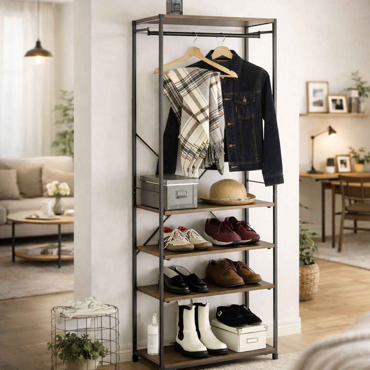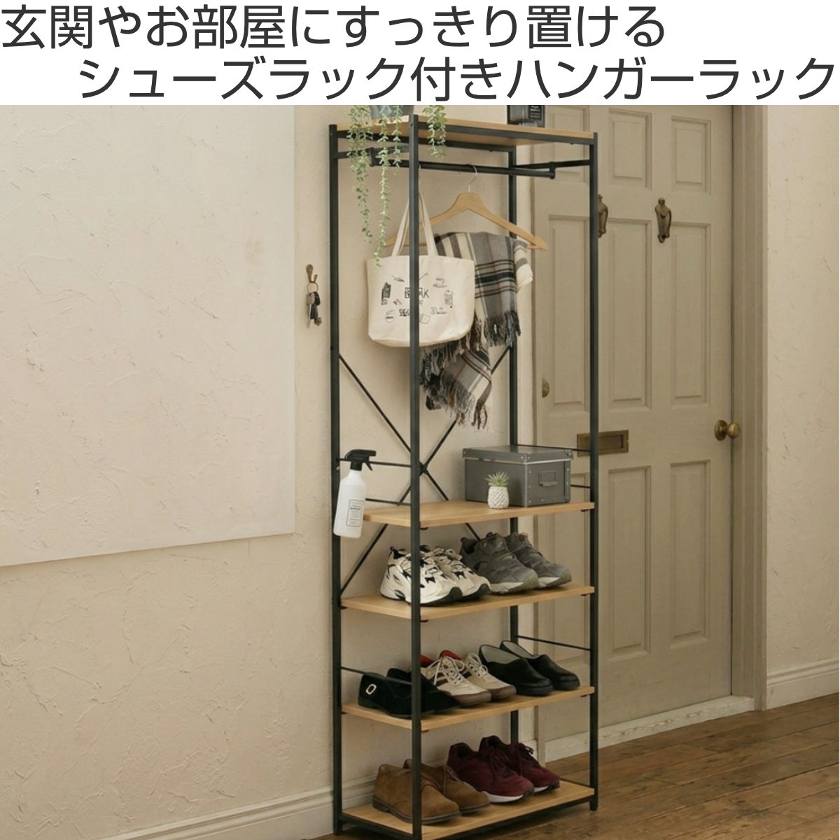 ハンガーラック 幅63.2cm シューズラック付き 木目調 ディスプレイラック