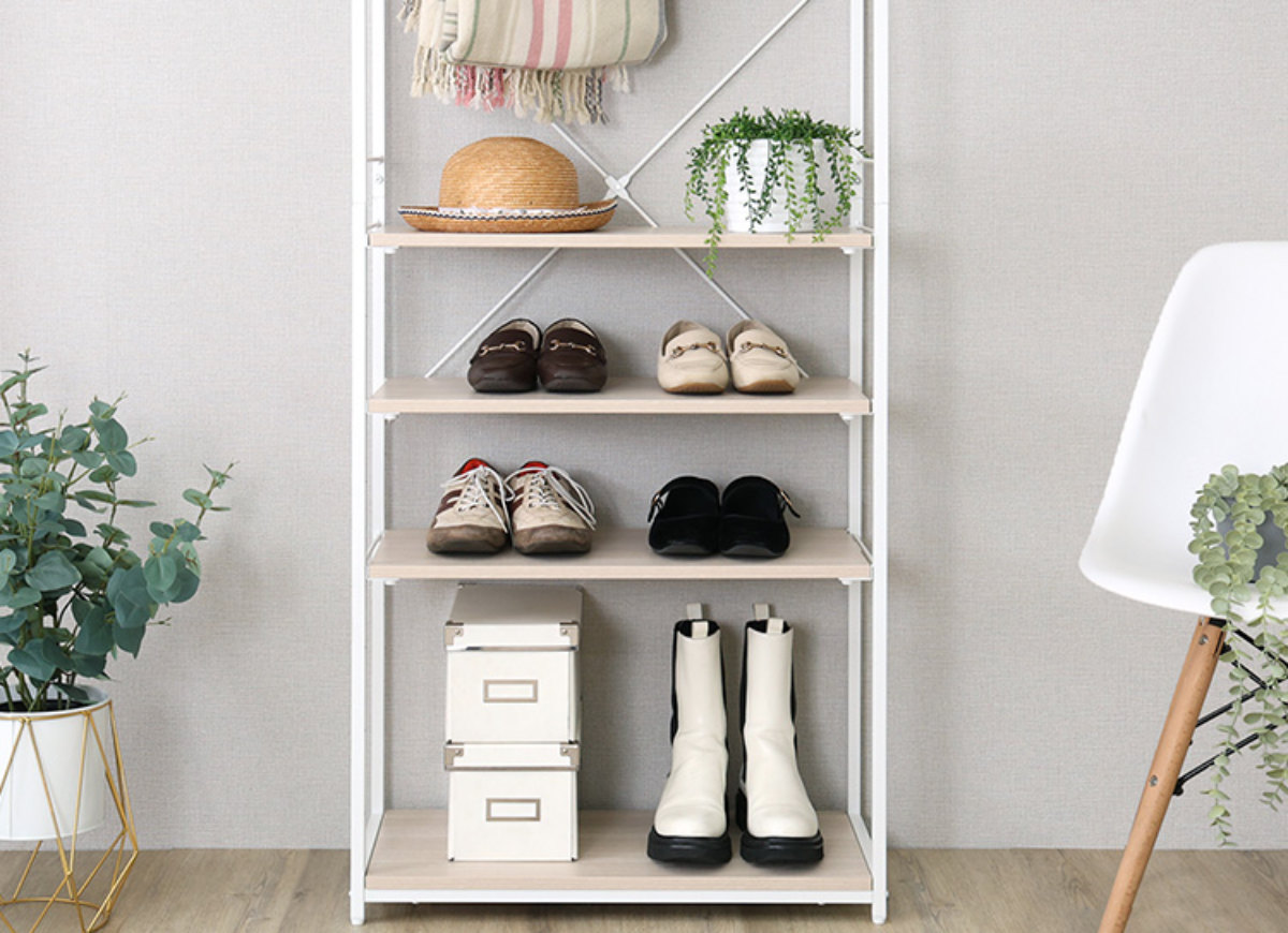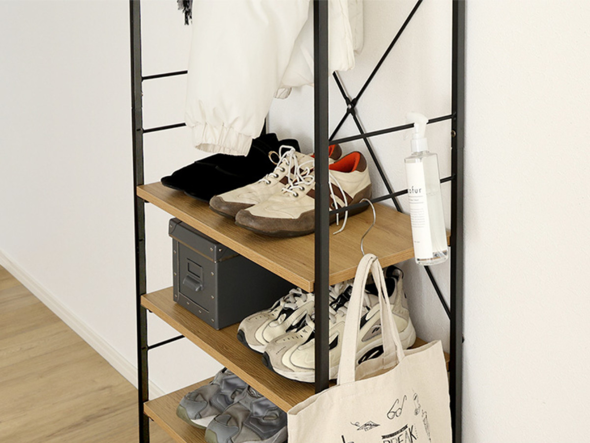 下段にはシューズはもちろん、帽子や雑貨などの小物類も収納可能です。棚板は手軽に高さを調整できるため、限られたスペースでも収納力をしっかり確保。毎日の身支度をスムーズにサポートします。
