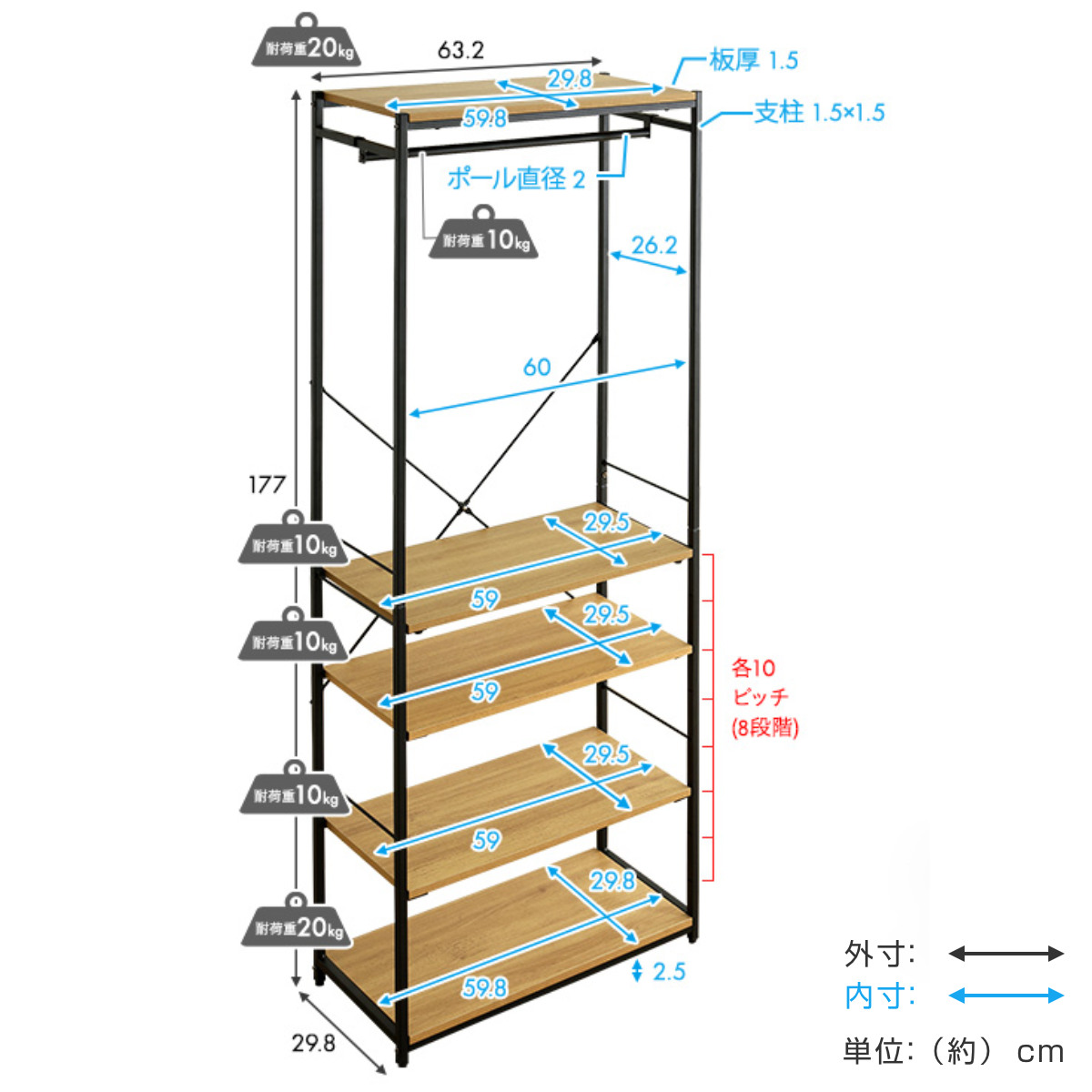 | 耐荷重 | ハンガーポール:10kg 上段・下段固定棚:20kg |