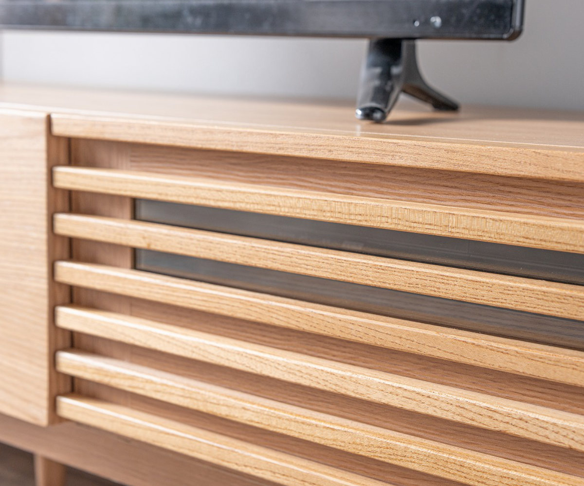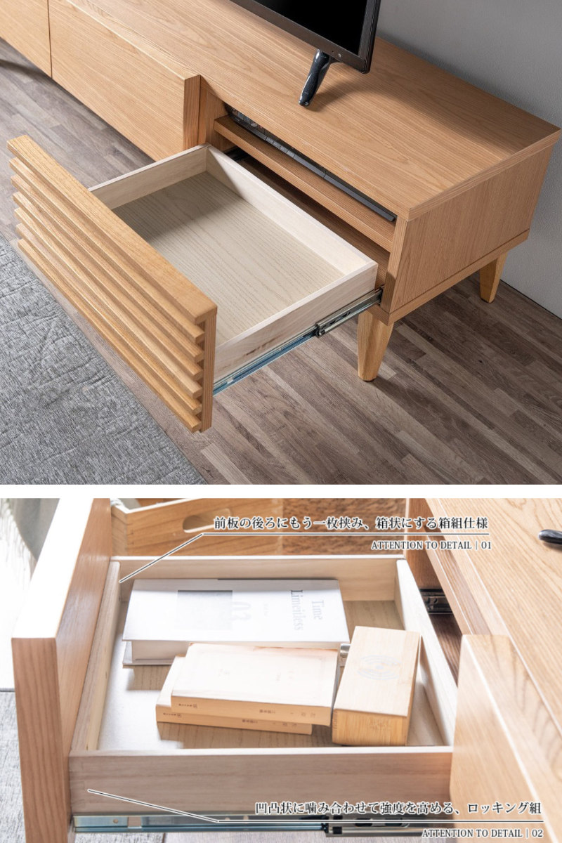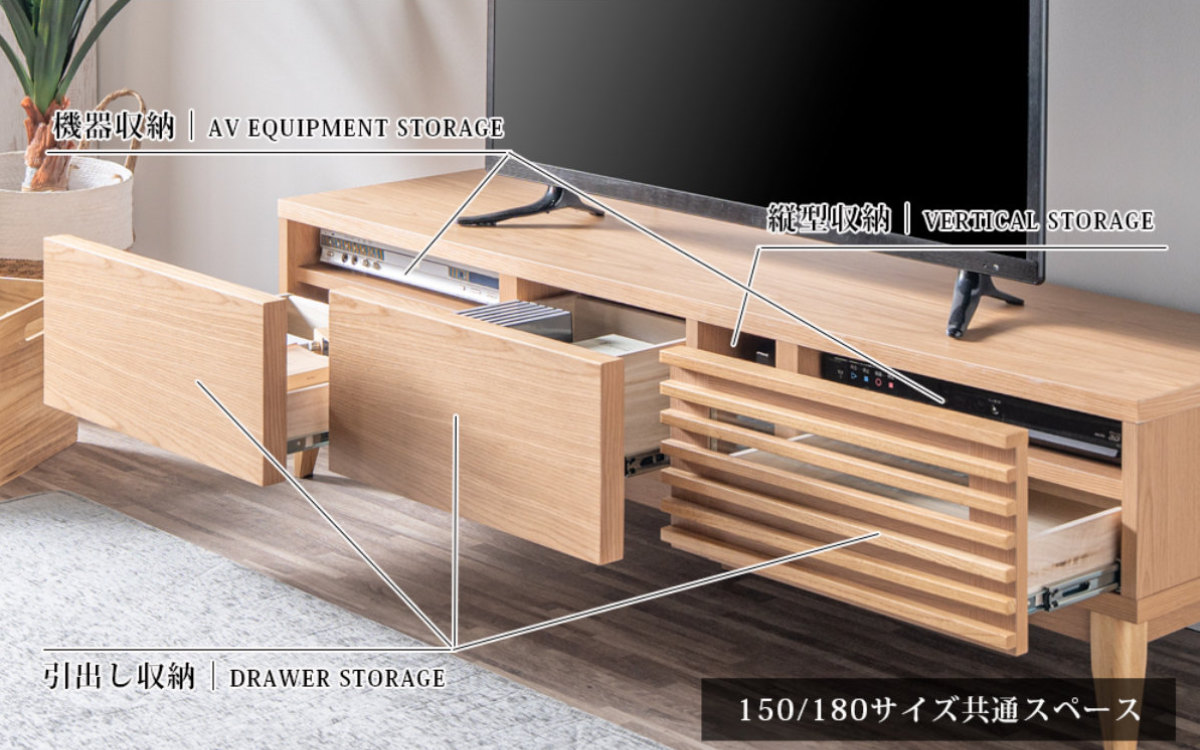 引出しやデッキ収納を備えた実用性に加え、ルーバーデザインが生む陰影が空間に奥行きをプラスします。様々なテイストに調和し、お部屋全体を心地よい雰囲気に整えます。テレビ台でありながら「見せる家具」としても楽しめます。