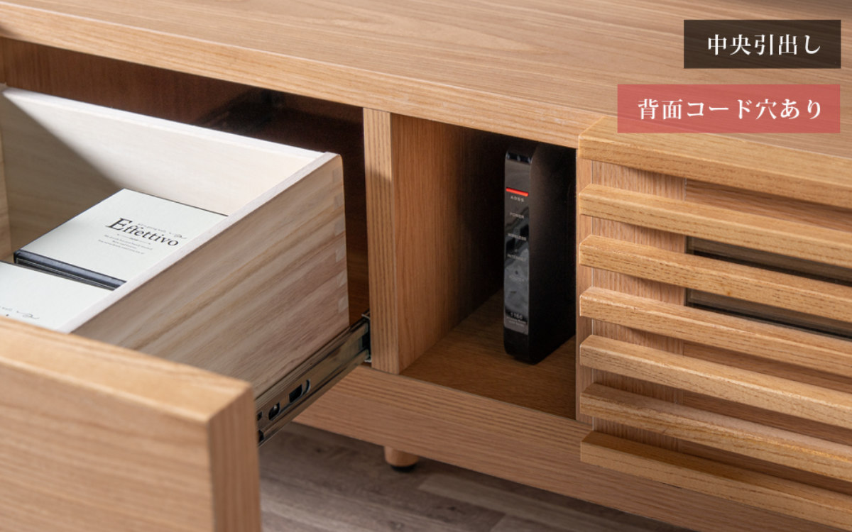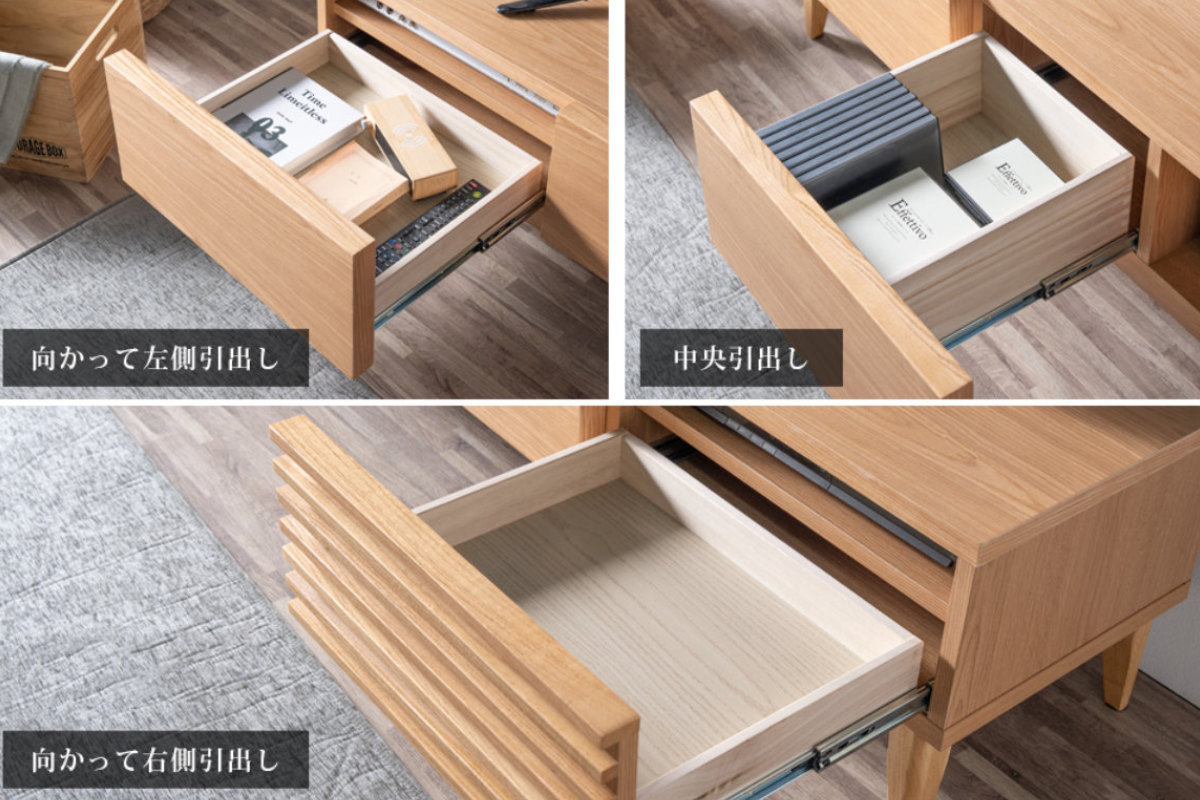 中央に配置された3杯の引出しは、日常小物から書類、AV周辺機器までしっかり収納できる大容量設計です。 細かいものもまとめて片付き、リビングを美しく保てます。