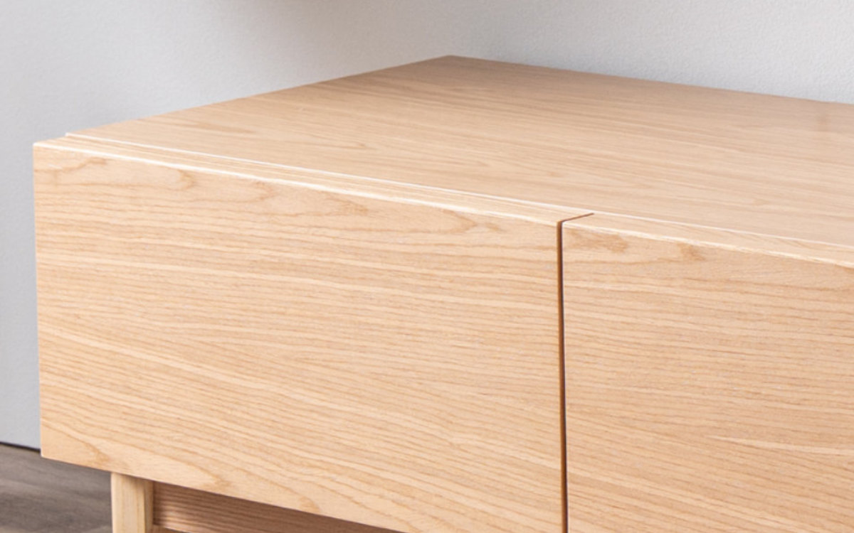 天板・前板は天然木工芸突板です。美しい木目と滑らかな手触りで、地球環境に優しい植林材を使った安心の作りです。