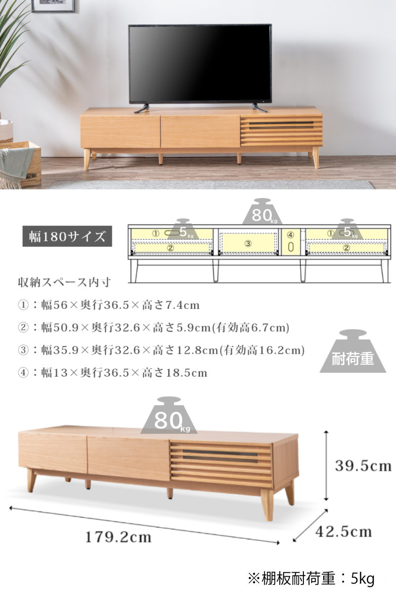 幅179.2cm、静止耐荷重80kgで、80型までの大型テレビに対応しています。