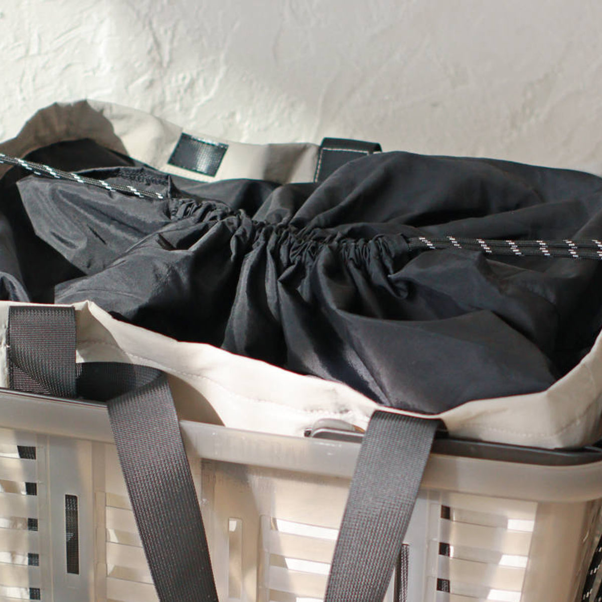 内側には光沢を抑えたアルミラミネート生地を使用し、簡易保冷・保温機能も備えています。開口部は巾着仕様で、紐を締めるだけで中身を日光やほこりからガードします。