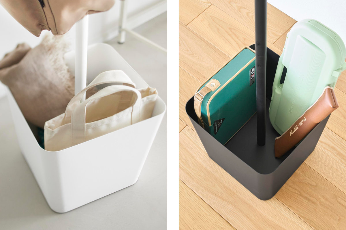 帽子などの小物が掛けられるフック付きで、長いアイテムもバスケットに収納できます。