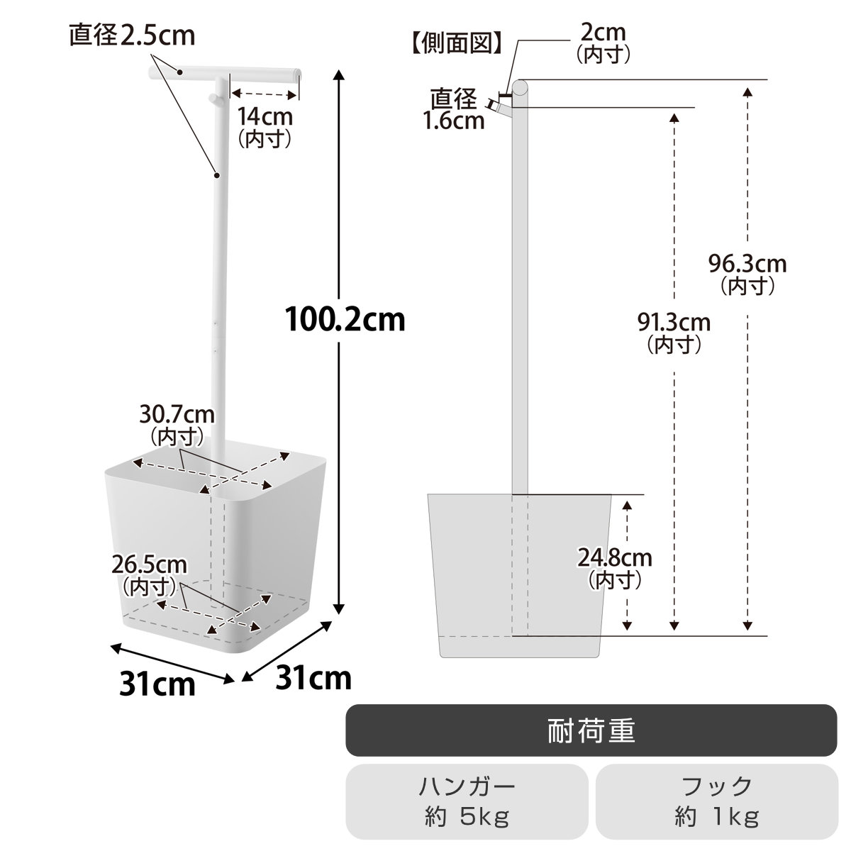 | サイズ | 約 幅31×奥行31×高さ100.2(cm) ハンガー片側あたり:約 幅14×奥行2.5×高さ2.5(cm) バスケット底部:約 幅26.5×奥行26.5(cm) 開口部:約 幅30.7×奥行30.7×高さ24.8(cm) フック:約 幅1.6×奥行2(cm) |