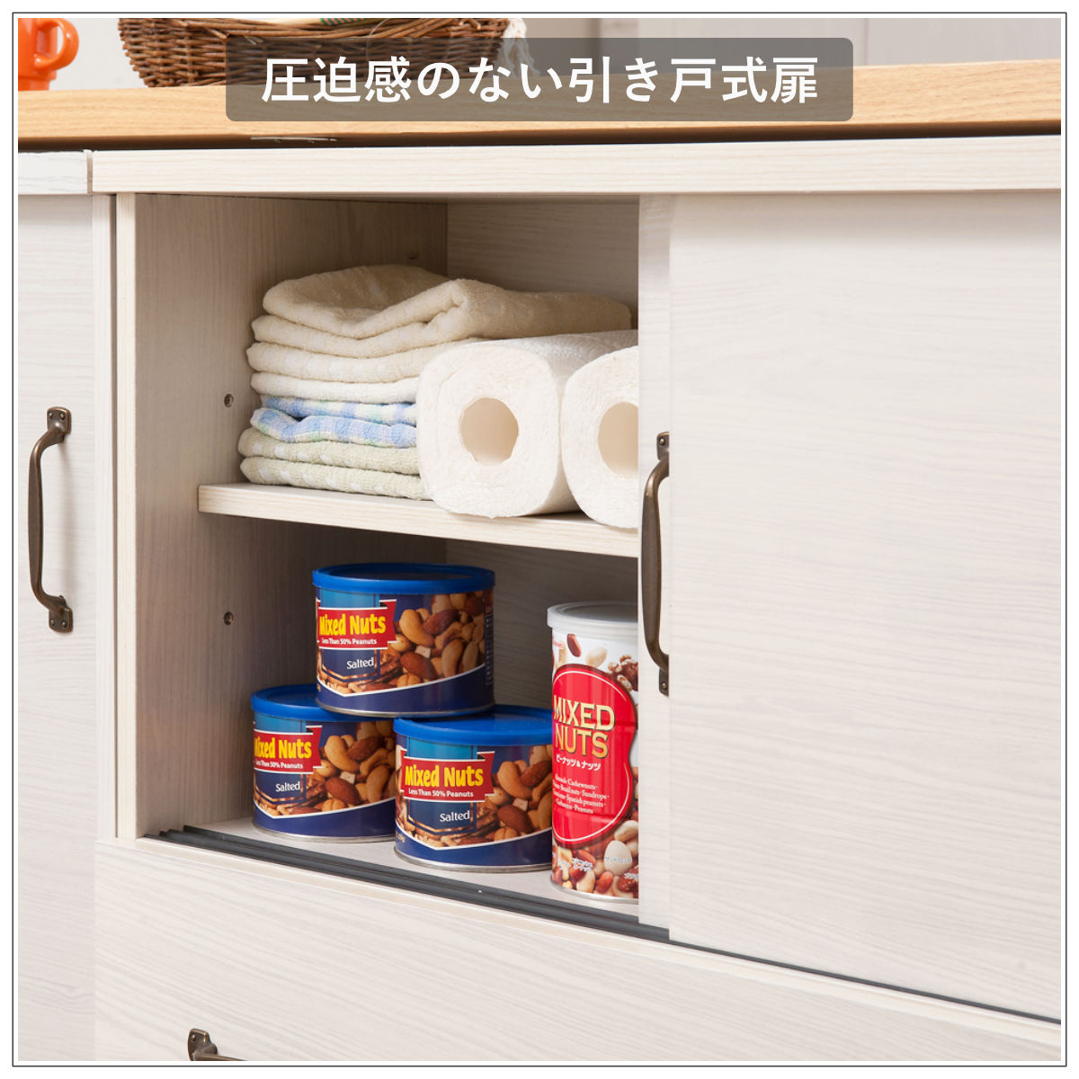上段の収納部は、狭いダイニングでも使いやすい引き戸式の扉で、お部屋に圧迫感を与えずに収納が増やせます。キッチンやカウンター下収納として、保存食品、食器やキッチン雑貨の整理にもぴったりです。