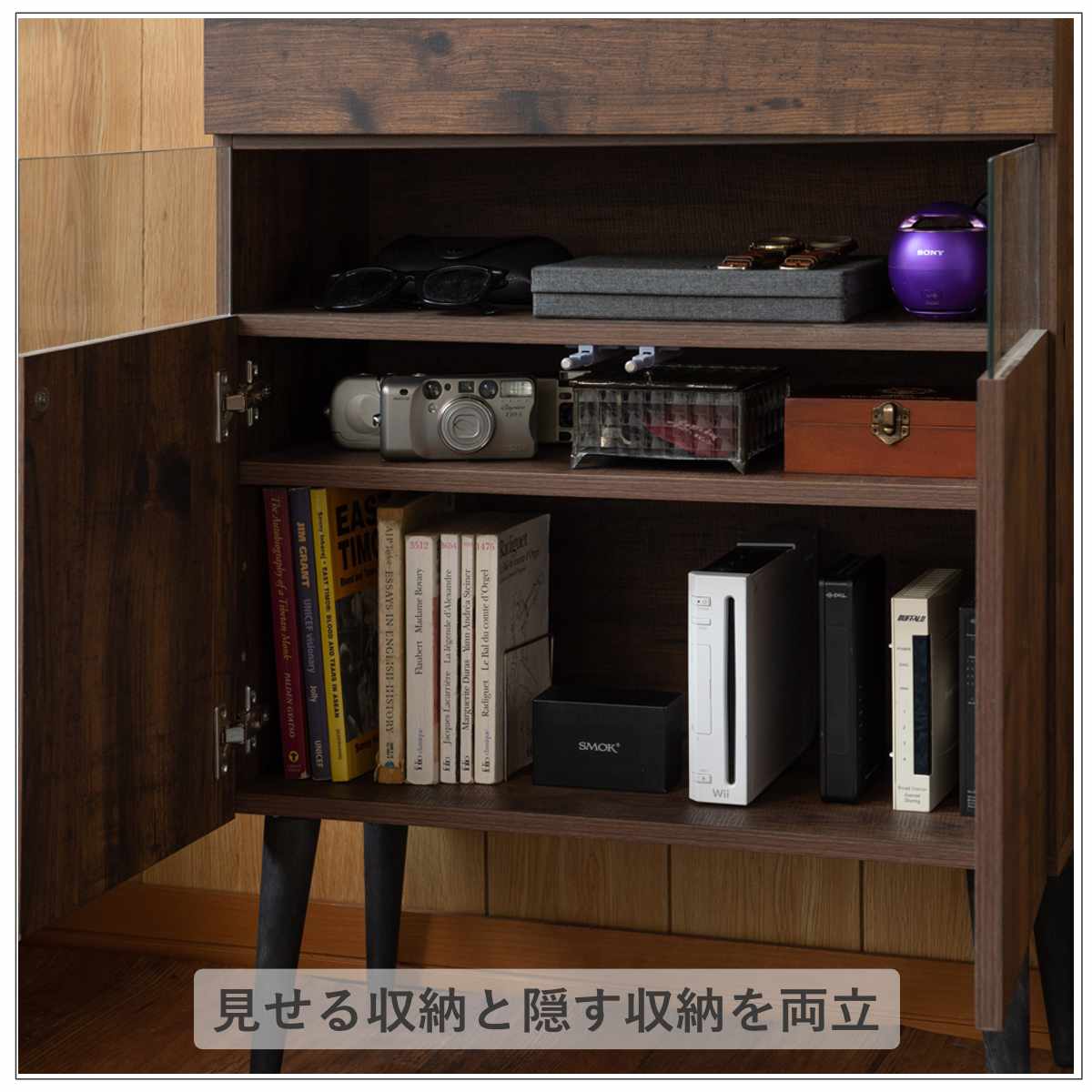 下段の収納扉はガラスと板を組み合わせており、見せる収納と隠す収納を両立できます。生活感のあるものは板扉に隠して収納し、ガラス部分にはお気に入りの雑貨を飾って楽しめます。扉はプッシュ式なので開閉がしやすいです。