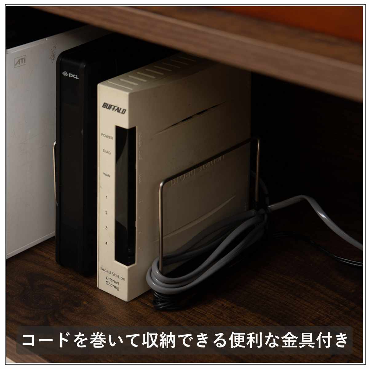 扉内にはルーターなどの収納に便利な金具が付いています。コードを巻いてまとめられるので、綺麗に収納することができます。雑誌などの本立てとしてもお使いいただけます。
