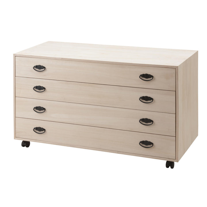 桐の素材の風合いをそのまま生かして作られた4段タイプの桐タンスです。和室、洋室どちらにも合うシンプルなデザインです。キャスター付きで移動の際に便利です。