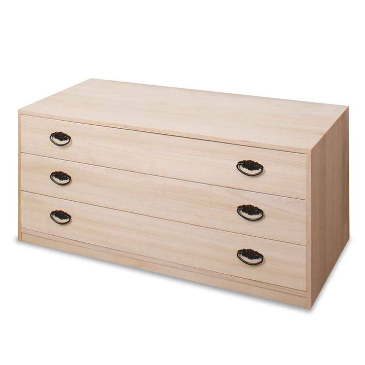 和洋問わずどんなテイストのお部屋にも合うシンプルな桐タンスです。塗装は一切せず、桐の素材をそのまま活かして仕上げています。少し大き目のたとう紙でも折らずに収納できるサイズ感です。