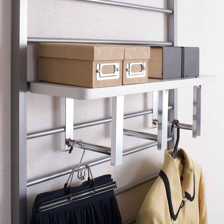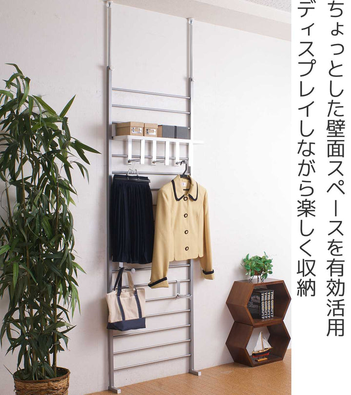 ハンガーパイプ付きの棚板が1枚付属しています。飾る&掛ける機能を兼ね備えた使い勝手抜群の棚板です。ラダー部分の好きな場所に移動できます。