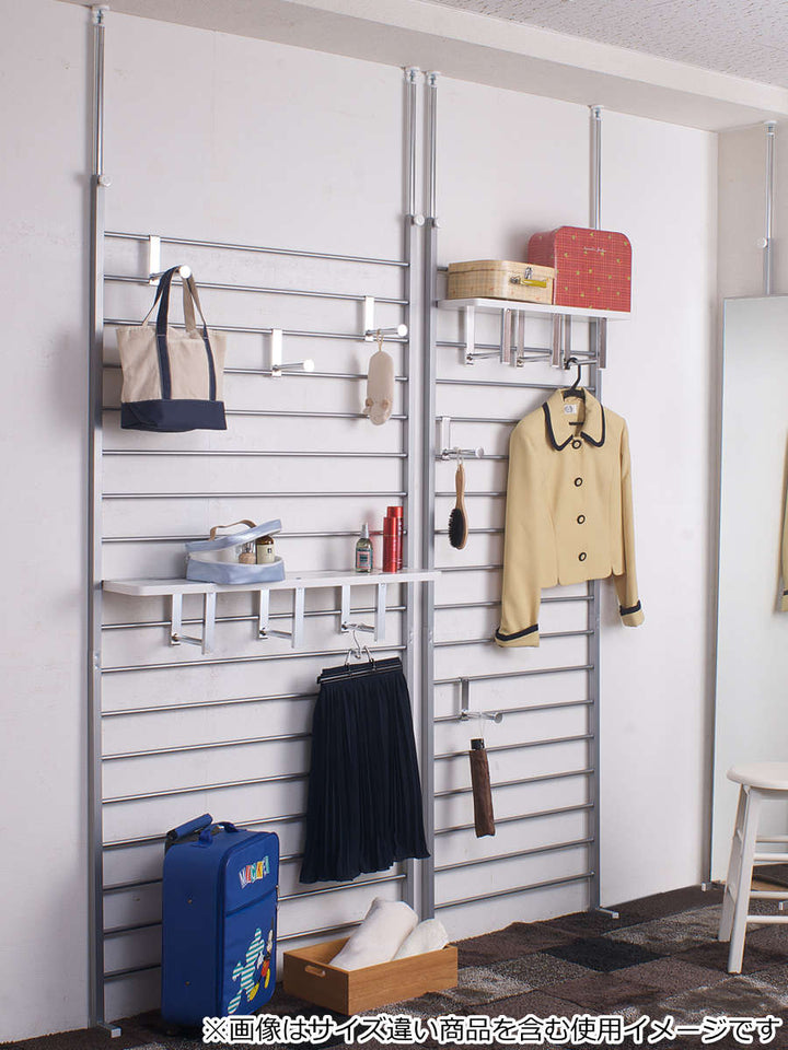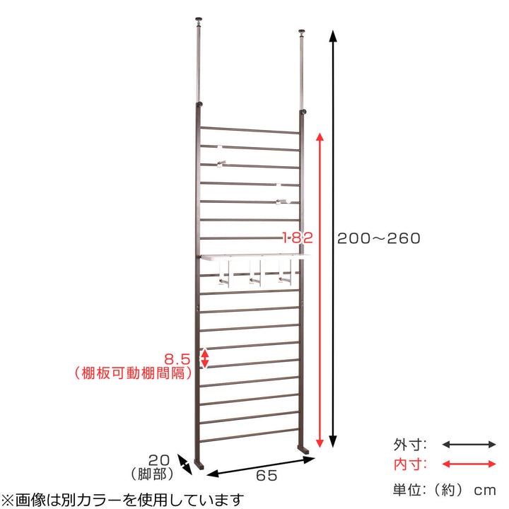 | サイズ | 本体:約 幅65×奥行20×高さ200~260(cm) 棚板サイズ:約 幅59.5×奥行17.5×厚み2(cm) フック出幅:約14cm 棚板可動間隔:約8.5cm |