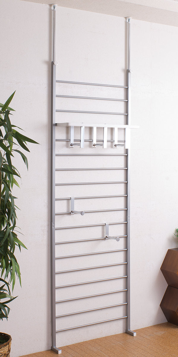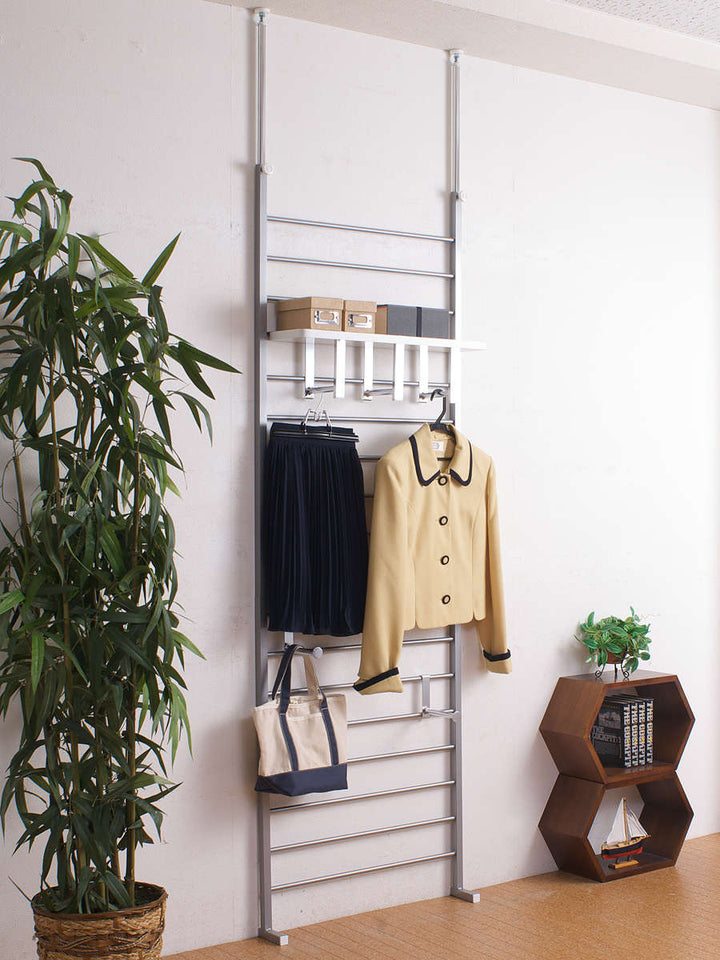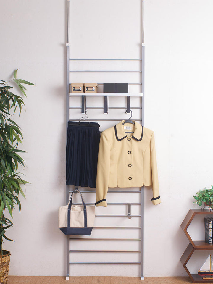 シンプルなのに機能が充実したラダーラック、65cm幅 シルバーです。ちょっとした壁面スペースにつっぱり式で簡単に設置できます。ディスプレイを楽しみながら収納でき、インテリアのアクセントにもなります。壁に穴を空けないので賃貸やワンルームにもおすすめです。
