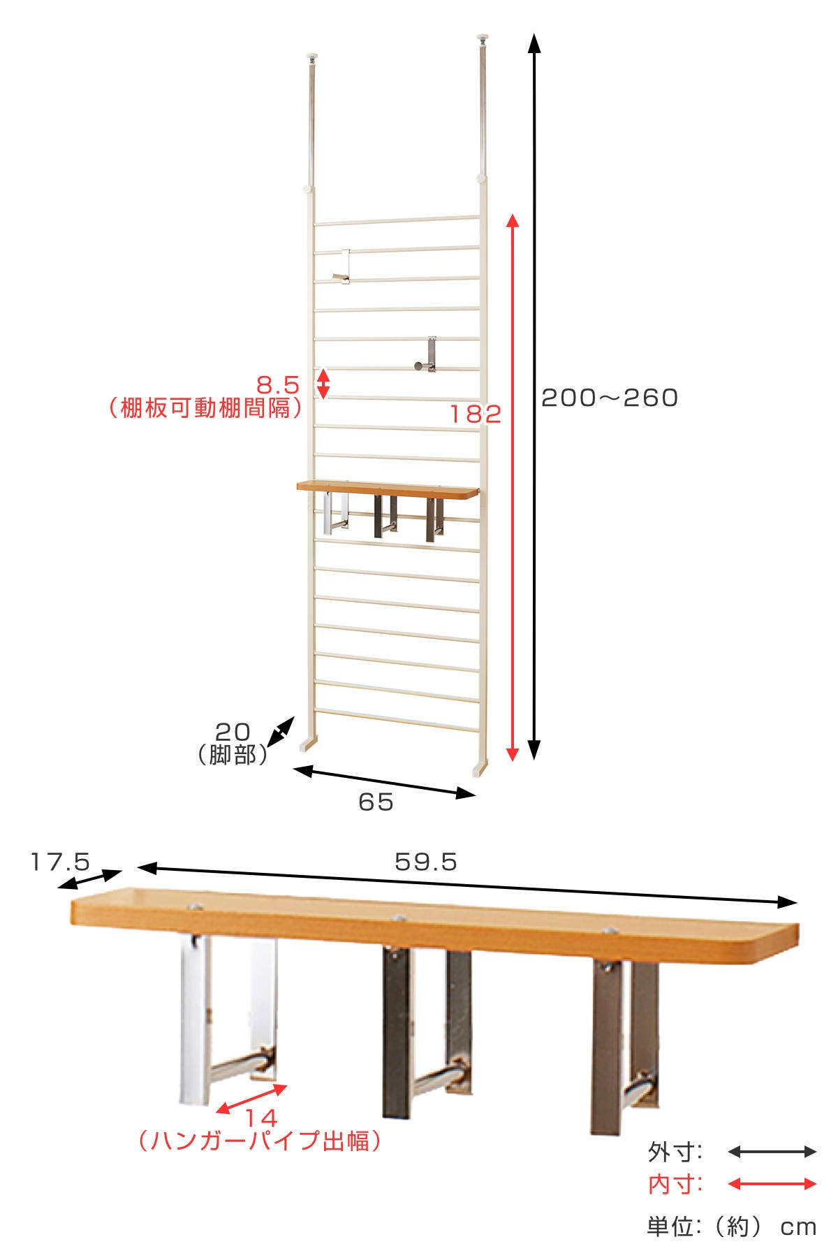 | サイズ | 本体:約 幅65×奥行20×高さ200~260(cm) 棚板サイズ:約 幅59.5×奥行17.5×厚み2(cm) フック出幅:約14cm 棚板可動間隔:約8.5cm |
