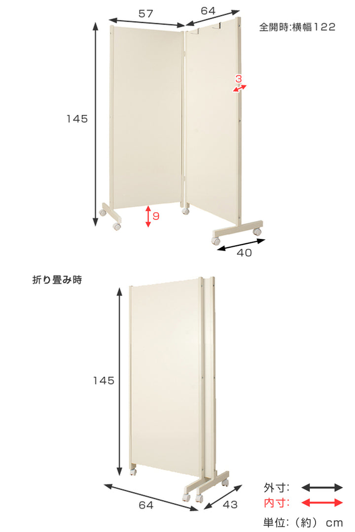 | サイズ | 本体:約 幅122×奥行3(脚部40)×高さ145(cm) 折りたたみ時:幅64×奥行43×高さ145(cm) 下部空間:高さ9cm フック出幅:6cm |