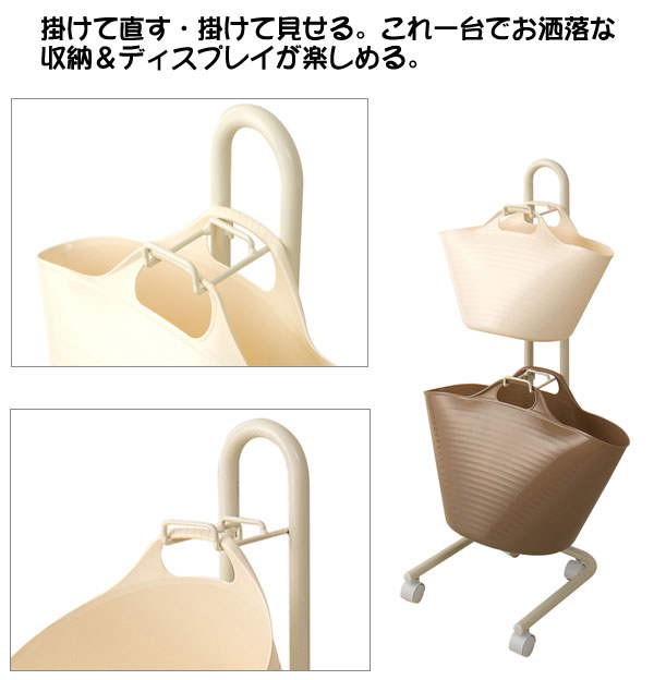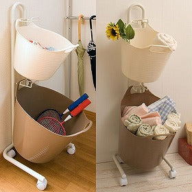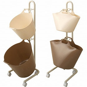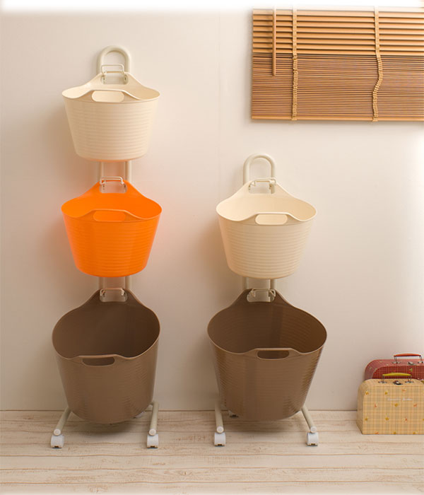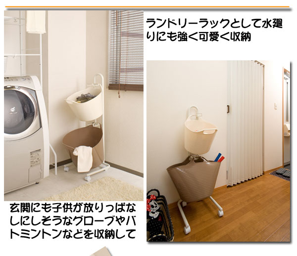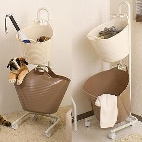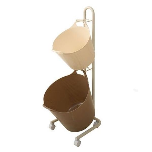 カラーリングが可愛いホワイトとライトチョコレートのゴムバケツがお洒落に納まるラックが