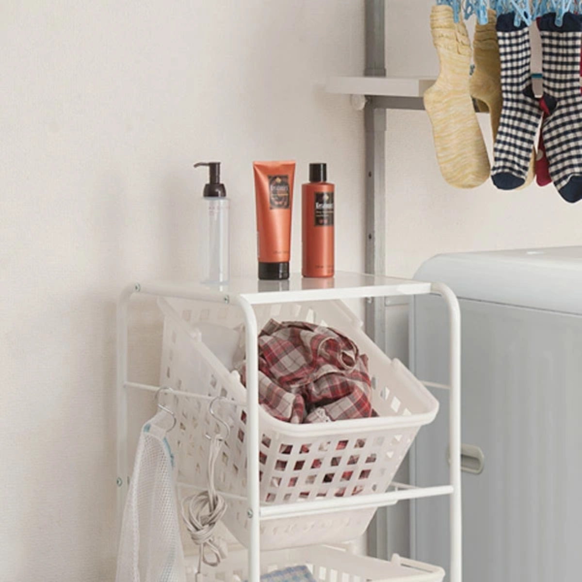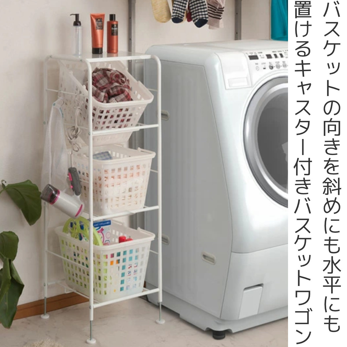 バスケットの向きを、頻繁に取り出す洗濯物などは斜めに、洗濯済みのタオルや洗濯グッズなどの小物収納には真っ直ぐにと、使い勝手が良いように変えられます。