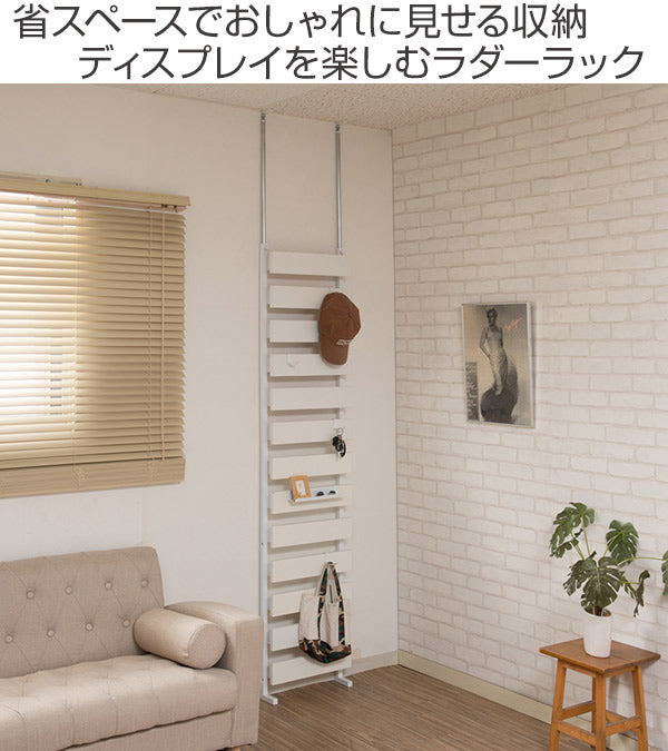 ラダー部分を収納として活用できます。立体的な美しいデザインで、付属のフックで帽子やバッグなどを掛けられます。また、別売りのプレートを設置して小物を置いたり、マガジンラックとしてもお使いいただけます。