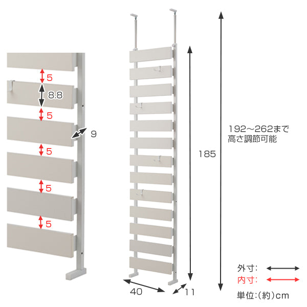 | サイズ | 本体:約 幅40×奥行9(脚部11)×高さ192〜262(cm)、ラダー間隔 :約 ラダー高さ8.8・すきま5(cm)、目隠し部高さ:約 185(cm) 重量:約 11.5kg |