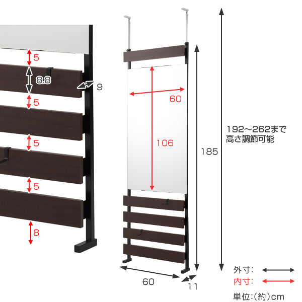 | サイズ | 本体:約 幅60×奥行9(脚部11)×高さ192〜262(cm)、ラダー間隔 :約 ラダー高さ8.8・すきま5(cm)、ミラー面:約 幅60×高さ106(cm)、目隠し部高さ:約 185(cm) 重量:約13.5kg |