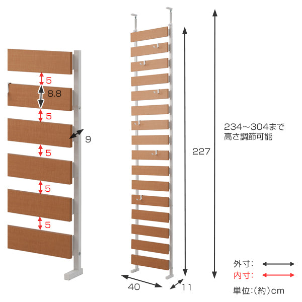 | サイズ | 本体:約 幅40×奥行9(脚部11)×高さ234〜304(cm) ラダー間隔 :約 ラダー高さ8.8・すきま5(cm) 目隠し部高さ:約 227(cm) 重量:約 14kg |