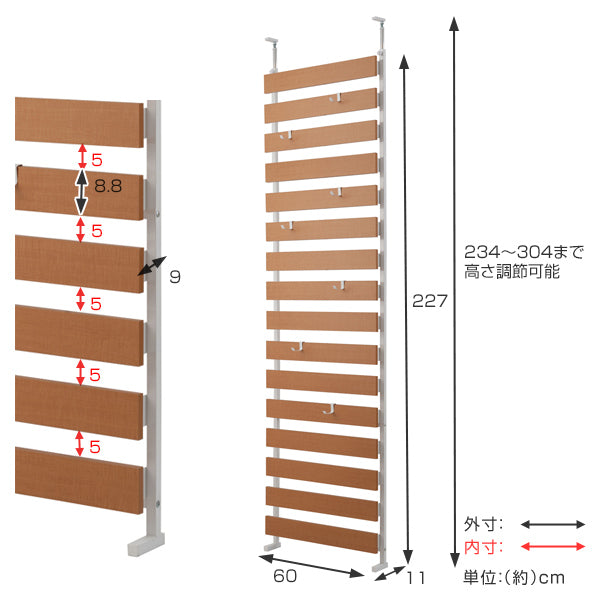 | サイズ | 本体:約 幅60×奥行9(脚部11)×高さ234〜304(cm) ラダー間隔 :約 ラダー高さ8.8・すきま5(cm) 目隠し部高さ:約 227(cm) 重量:約 17.5kg |