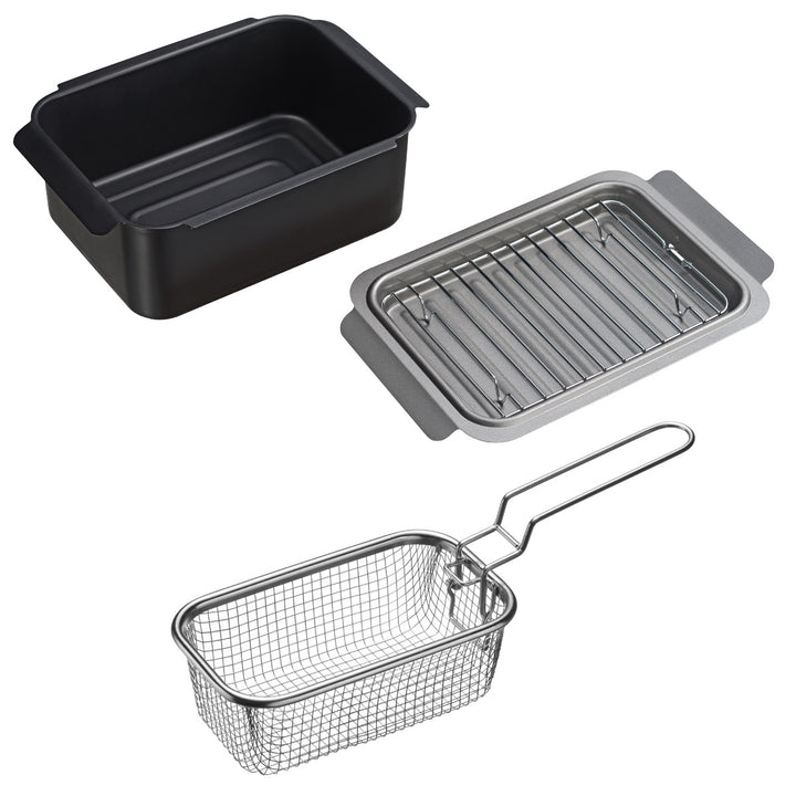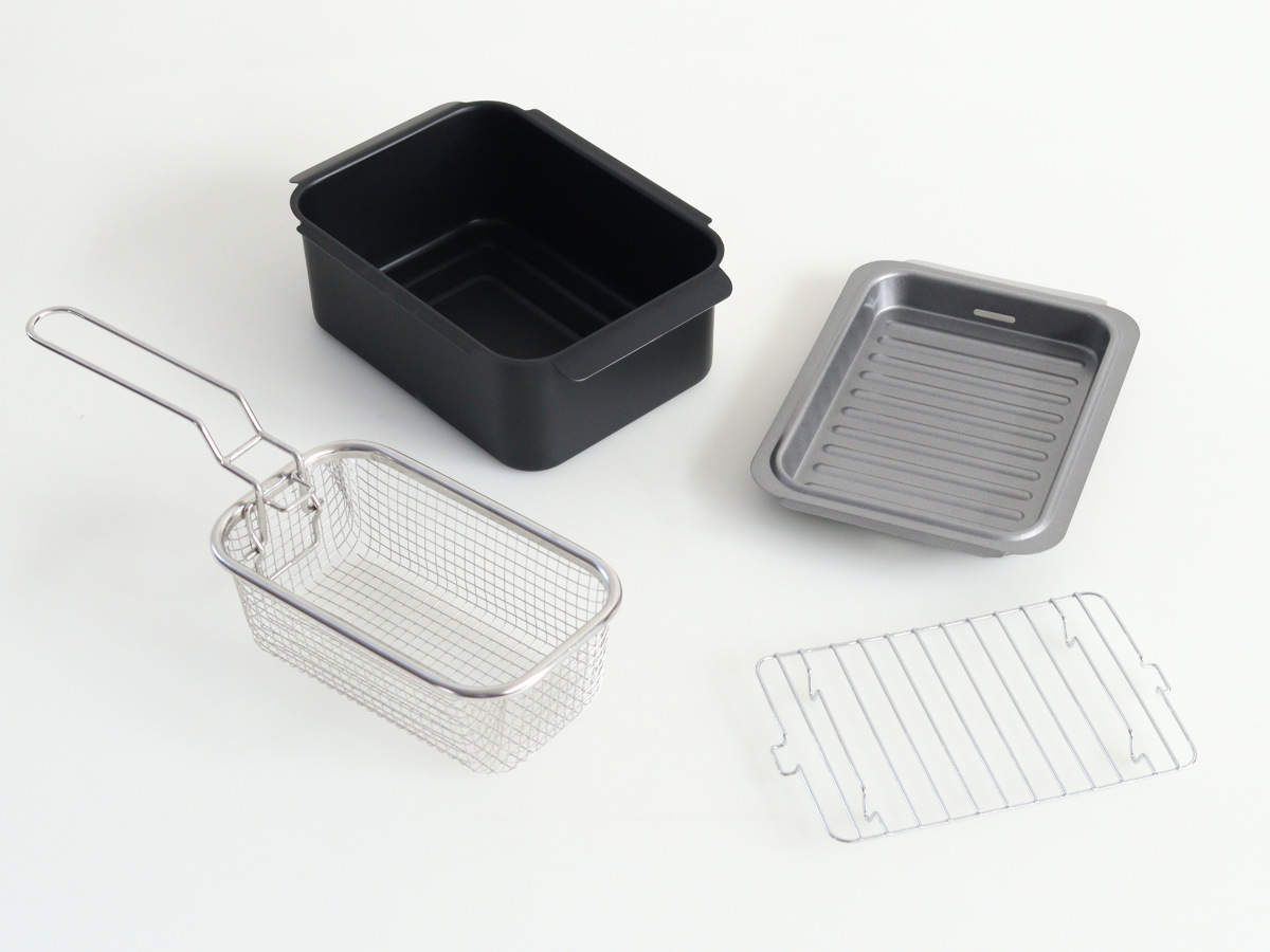付属の蓋は、バット代わりに下準備に使うことができ、調理中はアミと合わせて、油切りの受け皿として使用できます。そのままトースターで温め直すこともできるので便利です。