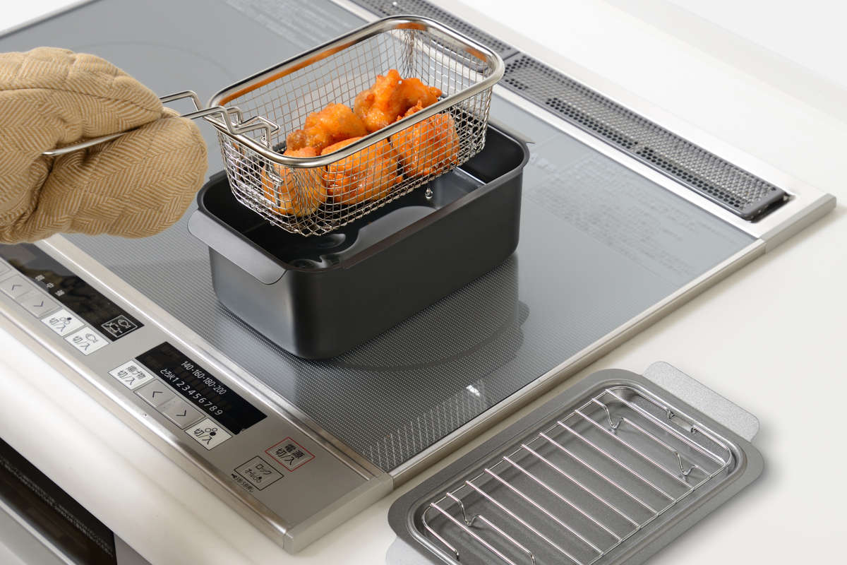 付属のアミと取っ手が折りたためる揚げざるは蓋裏に収納可能です。角型なので引き出しにすっきり収まります。