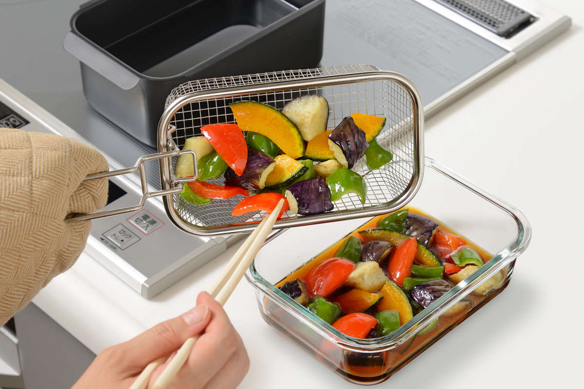 野菜などを素揚げして一気に引き上げて、そのまま保存容器に入れ、味付けすることもできます。洗い物も少なくなるので、家事の時短になります。