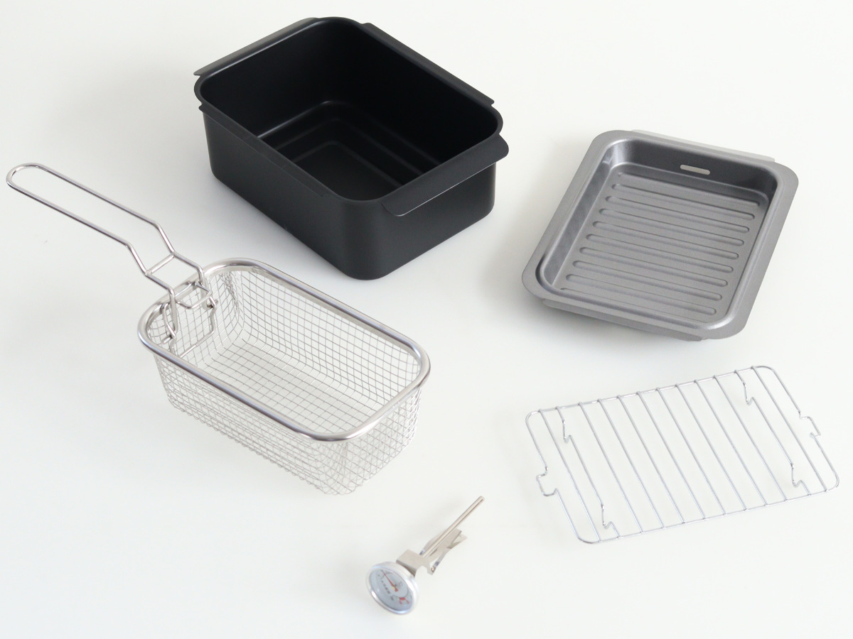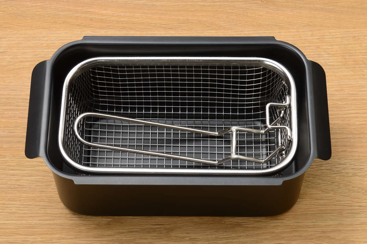 付属の蓋は、バット代わりに下準備に使うことができ、調理中はアミと合わせて、油切りの受け皿として使用できます。そのままトースターで温め直すこともできるので便利です。