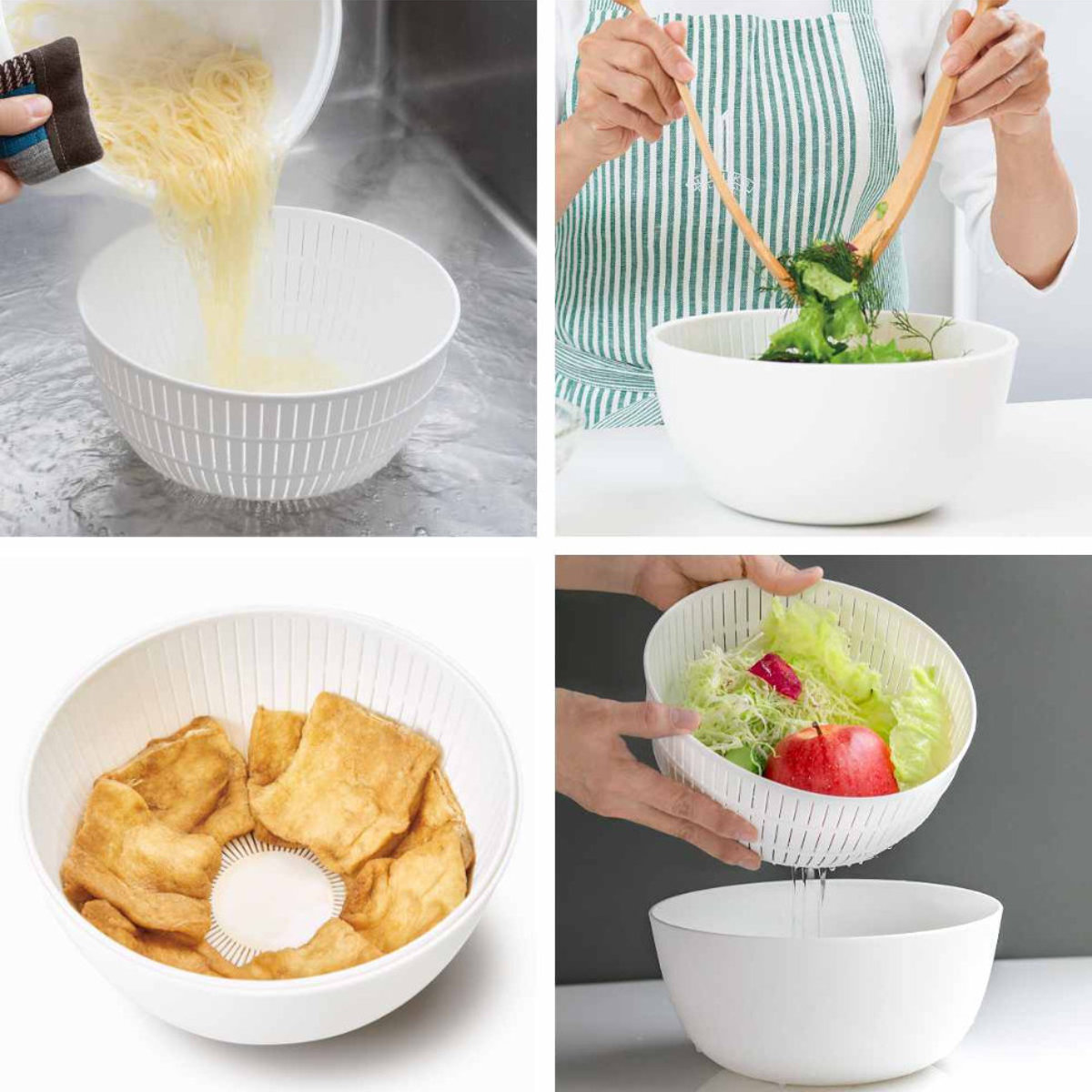 独自素材で耐熱性があるため、湯切りにも使うことができます。そのほか、ザルは野菜の水切りや油抜きに、ボウルは生地作りや和え物にと、毎日の調理を快適にアシストします。