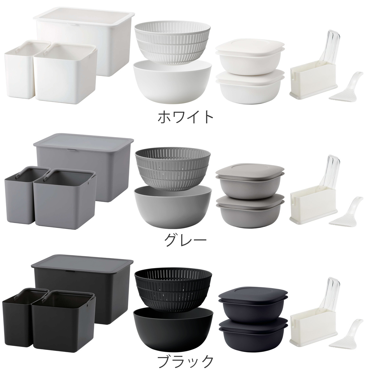 | 内容量 | 【セット内容】 米びつ×1セット(本体・インナーワイド・インナースリム・計量カップ) 米とぎボウル×1セット(ザル・ボウル) 冷凍ごはん容器×2個 しゃもじ・ケース×1個 |