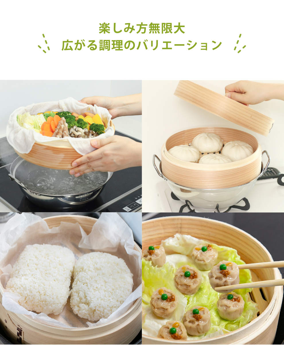 お野菜やシュウマイなどを蒸して、そのまま食卓に出せば、いつもの食事がちょっとした外食気分に。普段のお料理を、さりげなくワンランクアップしてくれます。