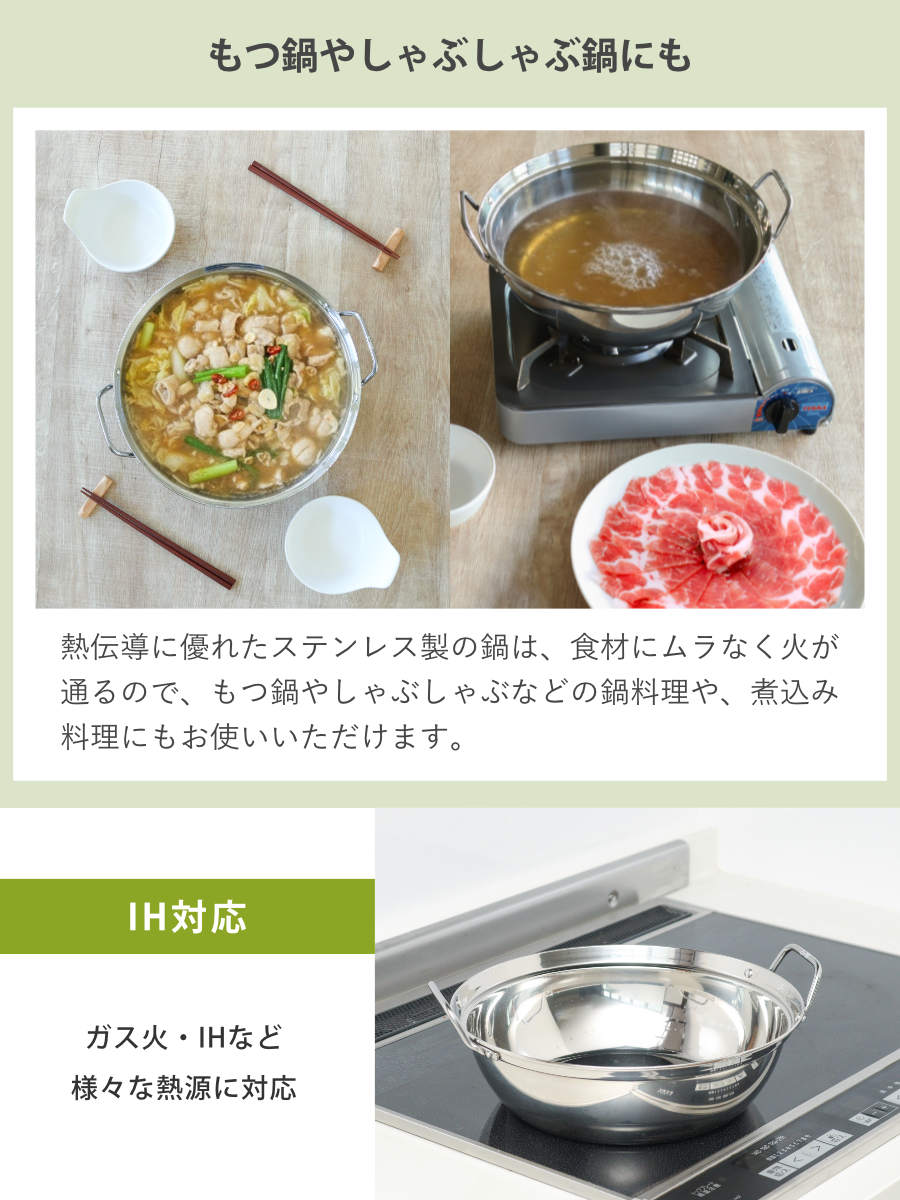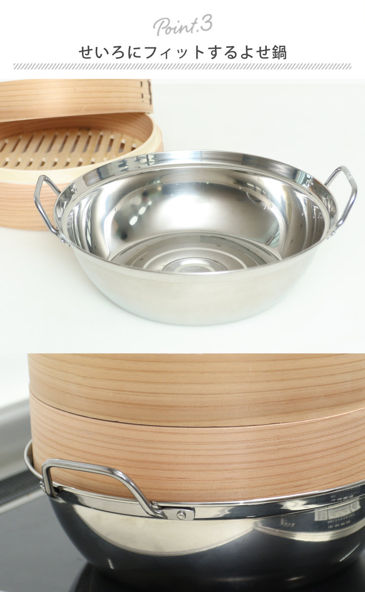 セットのシンプルで使いやすいステンレス製のよせ鍋は、じっくり煮込めるので、肉の旨みが野菜や豆腐にしみわたる、滋味深いもつ鍋にも最適です。鍋の内側に段がついているため、27cmのせいろをのせて調理できます。