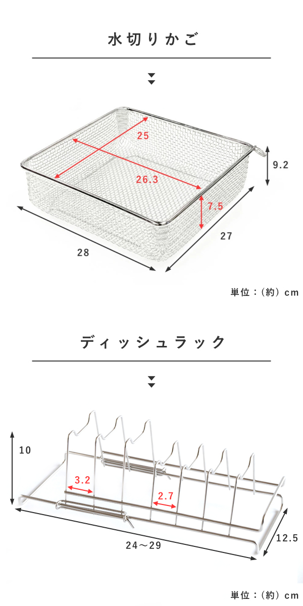 | サイズ | 【水切りカゴ】 外寸:約 幅28×奥行27×高さ9.2(cm) 内寸:約 幅26.3×奥行25×高さ7.5(cm) 【ディッシュラック】 約 幅24~29×奥行12.5×高さ10(cm) |
