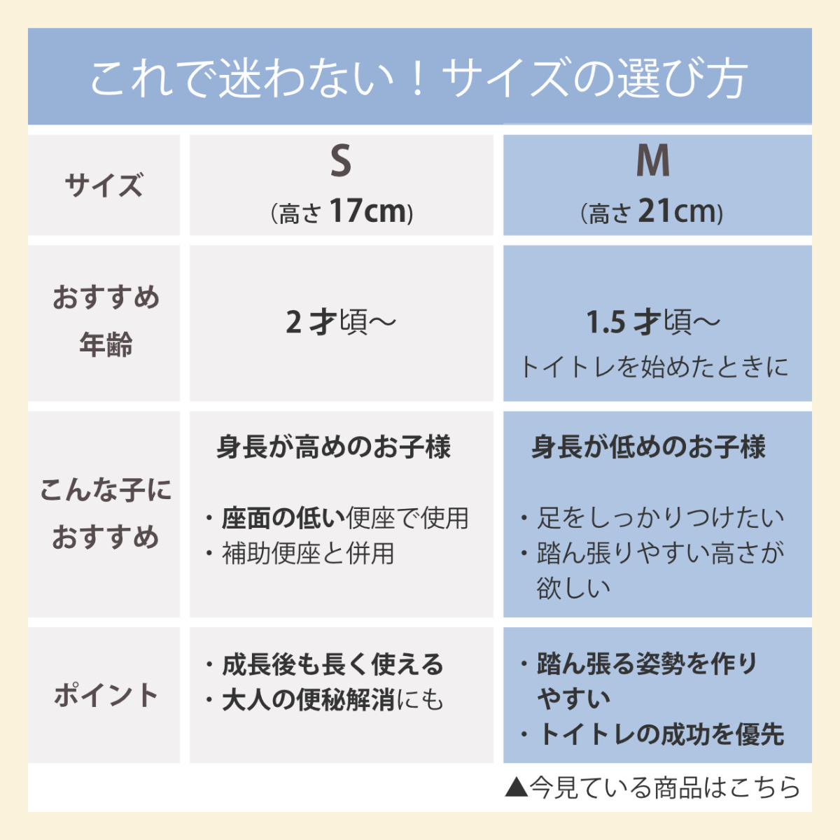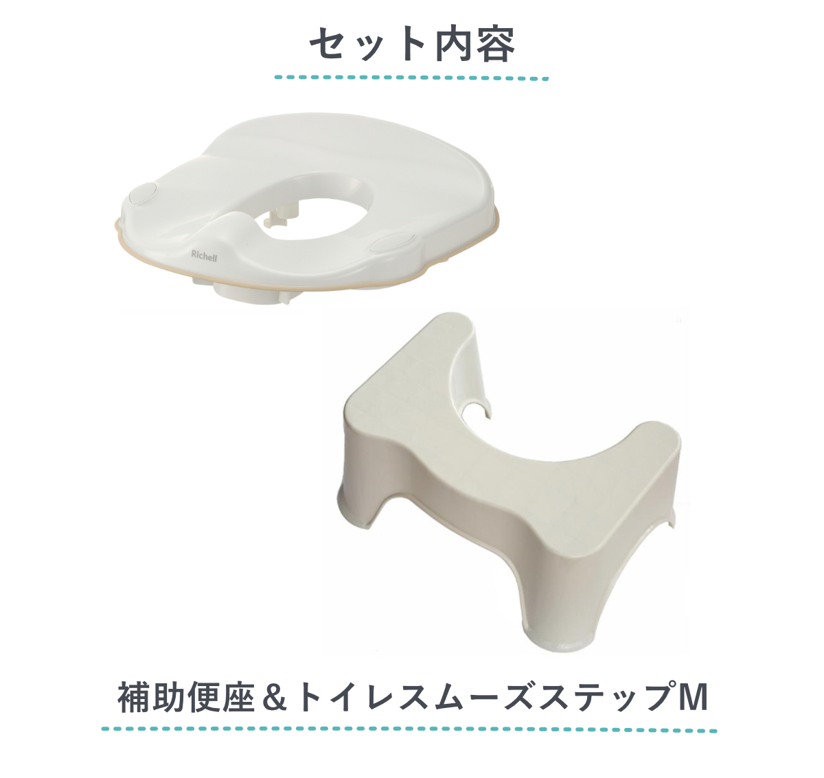 | 対象年齢 | 【補助便座】 グリップ付:1歳6カ月頃~4歳頃 グリップなし:2歳頃~4歳頃 【トイレスムーズステップM】 1歳6カ月頃~ |